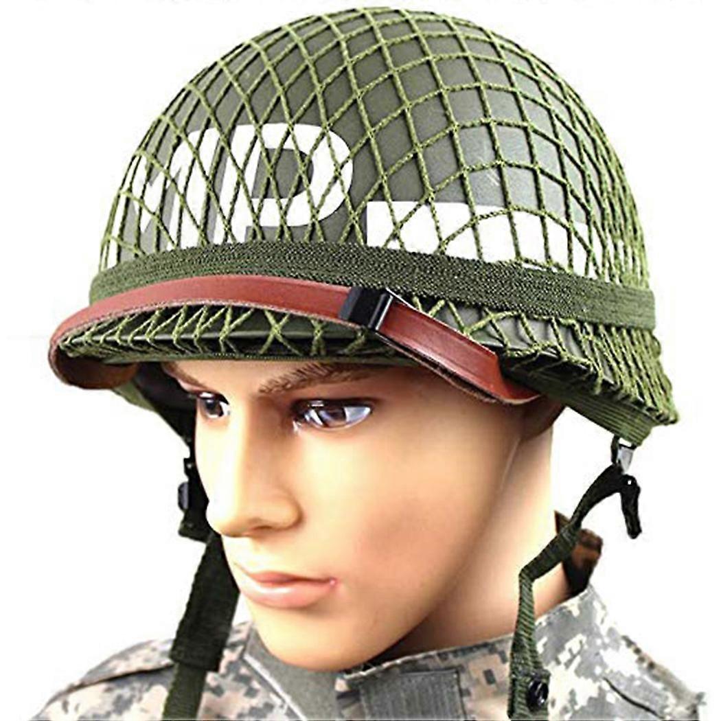Réplique parfaite du casque M1 vert de l'armée américaine de la Seconde Guerre mondiale, avec jugulaire en filet/toile à peindre soi-même, idéal pour l'airsoft, le paintball et le cosplay.