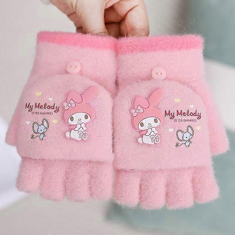 Sanrio Children Kuromi Gloves Winter Half Finger Flap Plush Mitten Girls Cartoon Thickened Warm Gloves Winter Gifts for Kids