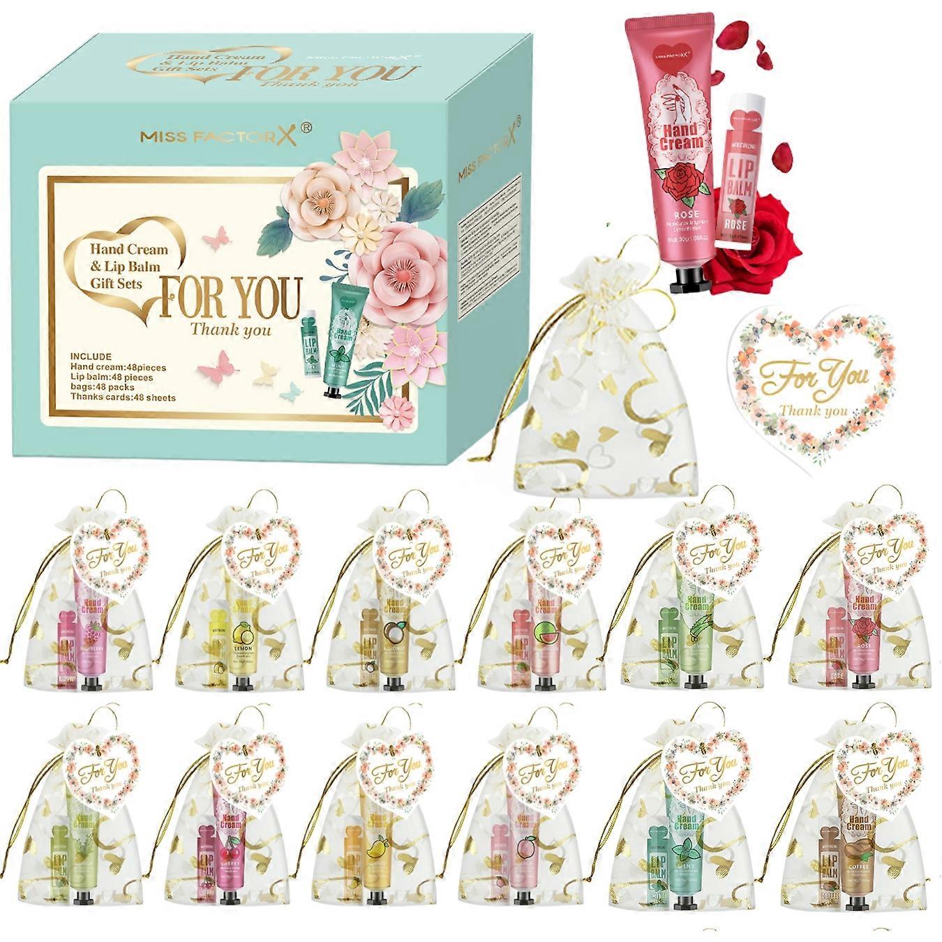 Gift set 48 sets/box, 12 kinds of scented lip balm and hand cream set with mesh bag and thank you card party gift