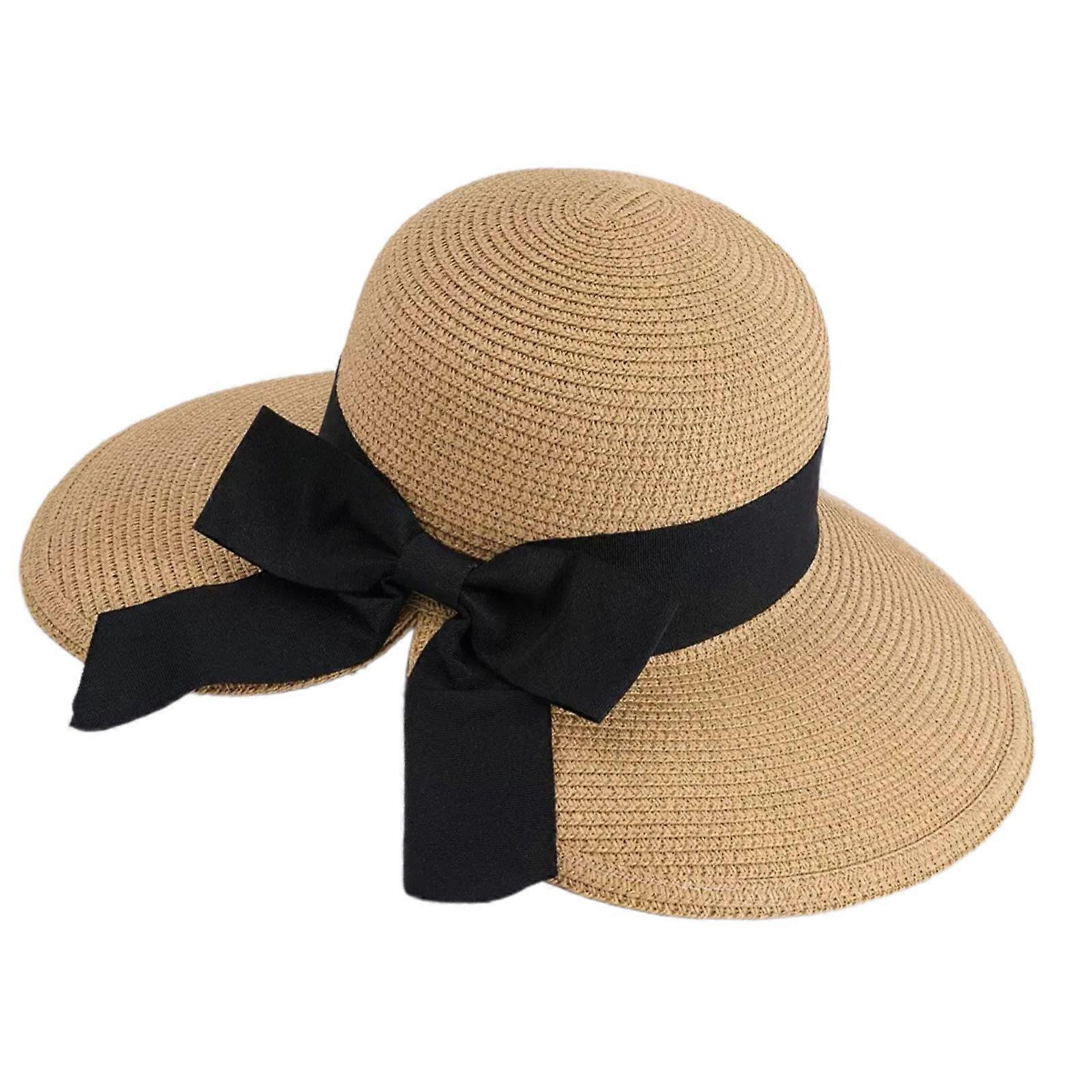 Elegant Woven Straw Sun Hat With Bowknot Wide Brims For Beach Outdoor Summer Sun Protection Foldable Design Travel Hat Shallow coffee