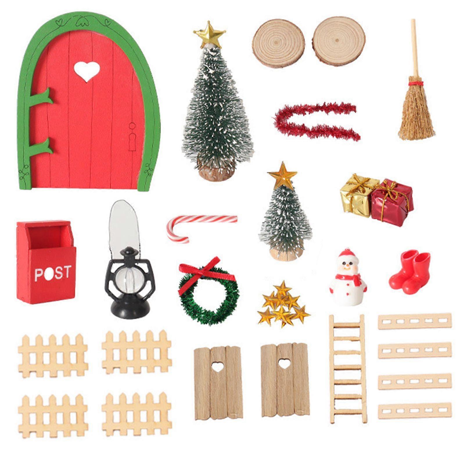 Jikaix Miniature Christmas Scene Model Wooden Elf Door Set Handmade Mini Wood Door Festive Holiday Dollhouse Decor