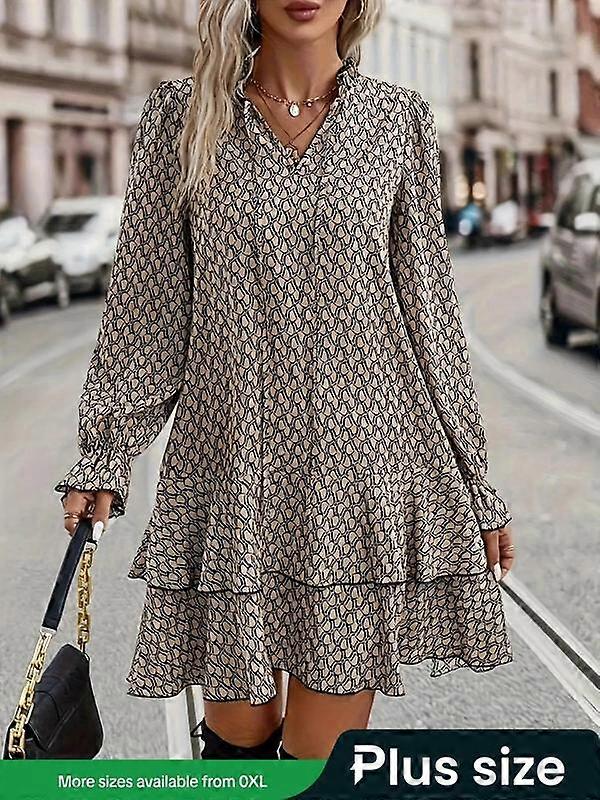 Plus Size All Over Print Frill Trim Tie Neck Ruffle Hem Dress, Plus Casual Flounce Sleeve Tiered Layer Hem Short Dress for Spring Fall, Wome