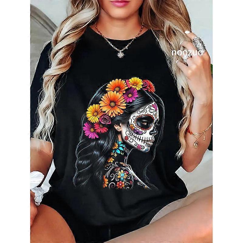 100% Cotton Unisex De Los Muertos La Catrina Day of the Dead Sugar Skull Women T-Shirt Cotton Unisex Graphic T-Shirt Crew Neck Blouse Black
