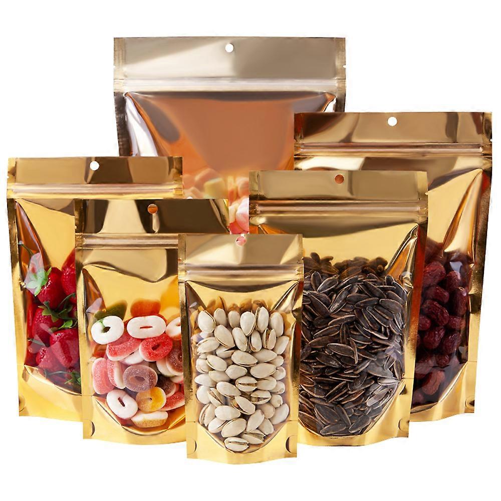 100Pcs Gold Aluminum Foil Clear Bag Zip Lock with Hang Hole Stand Up Tear Notch Reusable Food Nut Candy Packaging Pouches