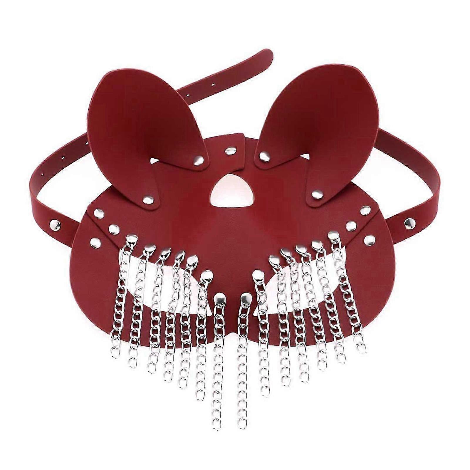 PU Leather Cat Mask with Chain Tassels for Women Men Costume Cosplay Halloween Mask Mysterious Half Face Punk Mask Red