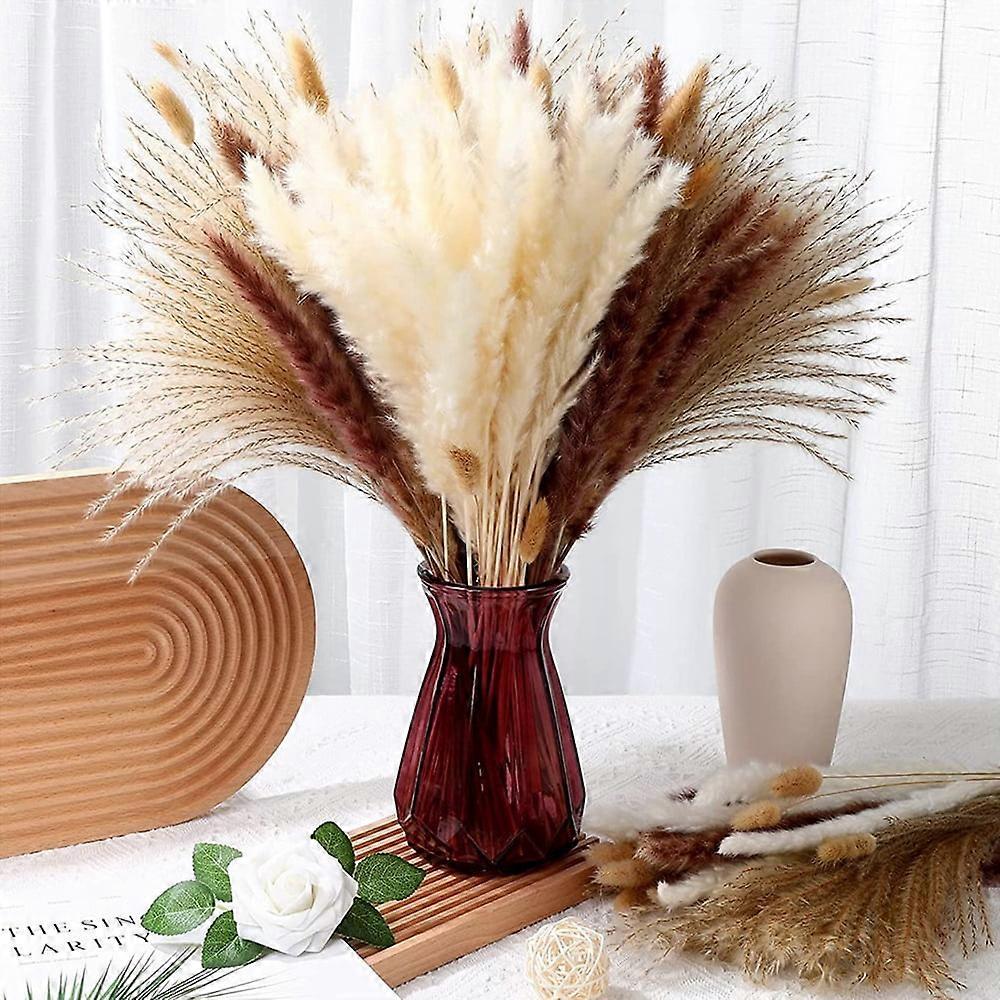 Product size: 44cm Product packaging: carton Packing size: 6*6*44cm How to use: as shown in the figure Product material: dried flower Package list: 100* dried flowers Notes: 1. 1 inch = 2.54 cm 2. Please measure it yourself to choose the right size. 3. Due to the difference between the different displays, the picture may not reflect the actual color of the item. Thank you! Product features: rich quantity: the package includes 4 different types of 100 pieces of grass, small reed white 15 + small reed primary color 15 + floating dust 20 + rabbit tail primary color +50; sufficient quantity and style can fully meet your decoration needs and personal preferences Natural Materials: This dry pampas grass decoration is made from pampas grass, using fine drying technology, safe and odorless, can maintain the original appearance and beauty; As a result, the dry Papas prairie naturally remains beautiful year after year without additional maintenance or care The right size and color: This fluffy pampas is about 43 cm/17 inches long, and you can trim it to the right size to fit vases of different heights; Its main colors are white and brown, simple and elegant, bringing warmth and freshness to your home décor Elegant and glamorous: these bohemian party décor is suitable for indoor and outdoor occasions on holidays or important days; When you put them in the living room, bedroom, dining room, apartment, office, garden, balcony, hotel, etc., you can enjoy elegance and charm Multiple uses: Bohemian style wedding decoration is convenient for use as decoration; You can put it directly in a vase or hang it on a wall or window with a string and hook (not included); In short, you can choose different decoration methods according to your needs and preferences