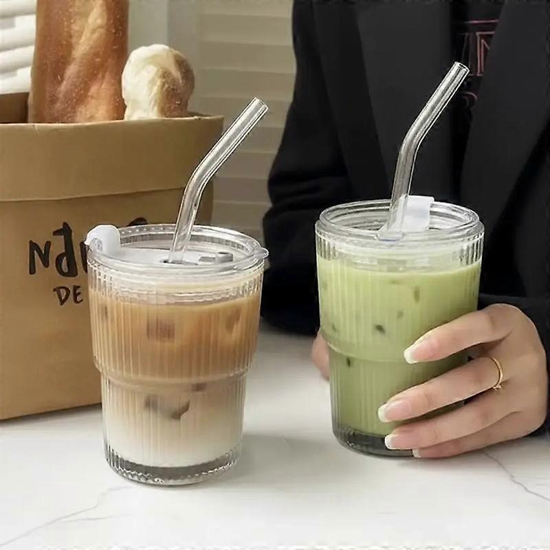 Glass Coffee Mug Set with Lid and Straw, Vertical Striped Design, 13.53oz & 20.29oz Sizes, Perfect for Ice Americano Latte Water
