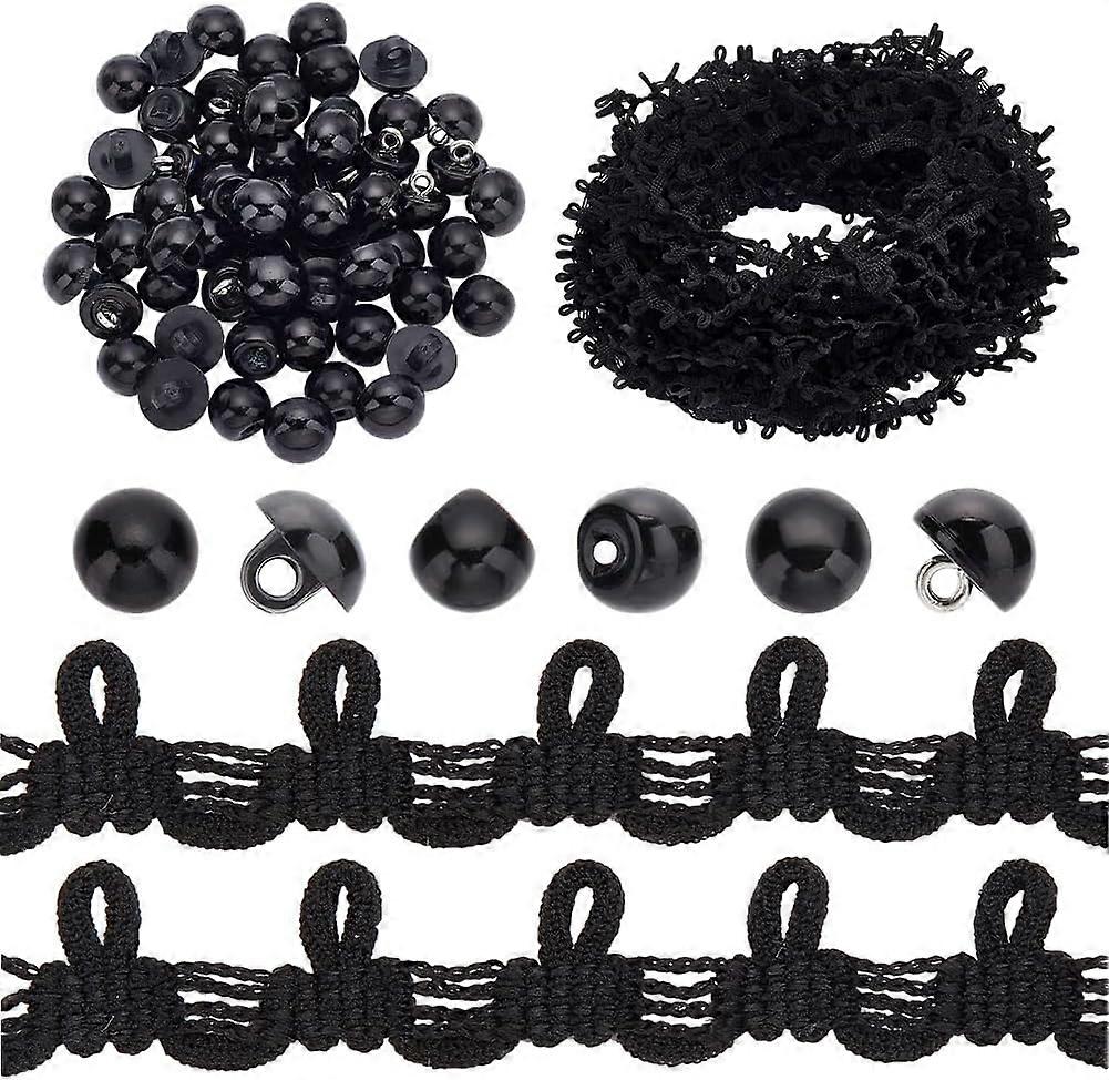 20 Yards Braid Trim w/ Elastic Button Loops, 60pcs Buttons, Black Tassel Fringe Lace for Sewing, Costumes, Crafts, Clothing Decor - Compatible with