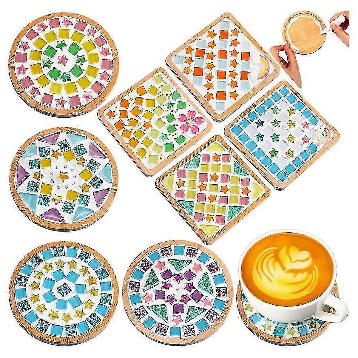 8 Sets DIY Glass Mosaic Tile Crafts, Mixed Color Mosaic Kits with Wooden Coasters