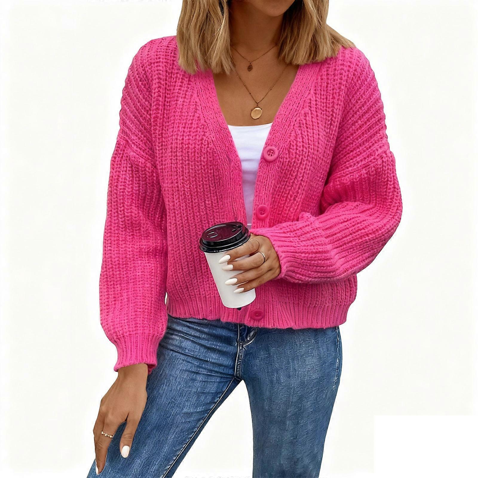 Women's Button Up Cropped Cardigan Sweaters Chunky Knit Long Sleeve Trendy Cardigans rose red XL