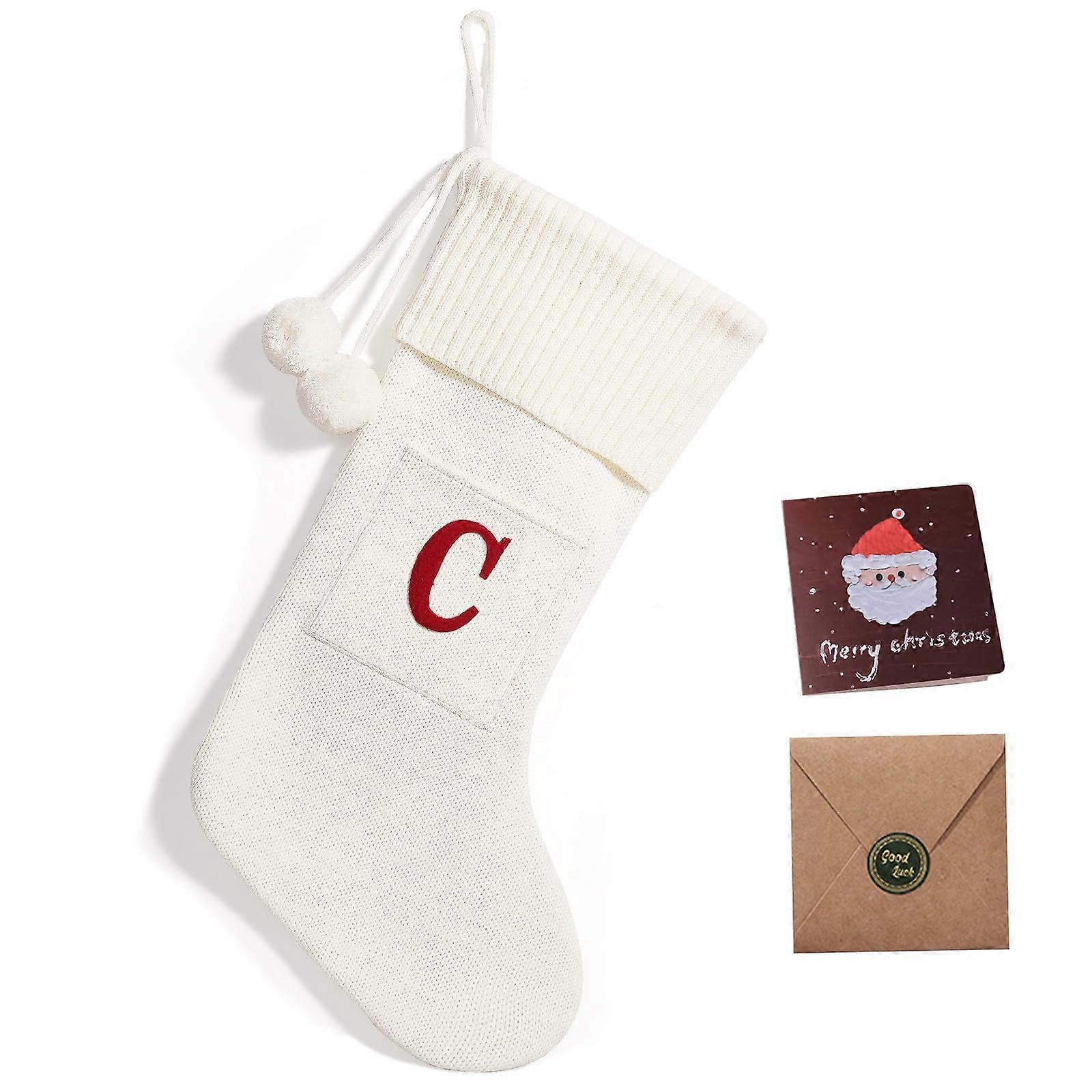 Christmas Stocking with Initial, 16.5 Inch Knitted Fireplace Hanging Decor for Family Holiday Party (White C)