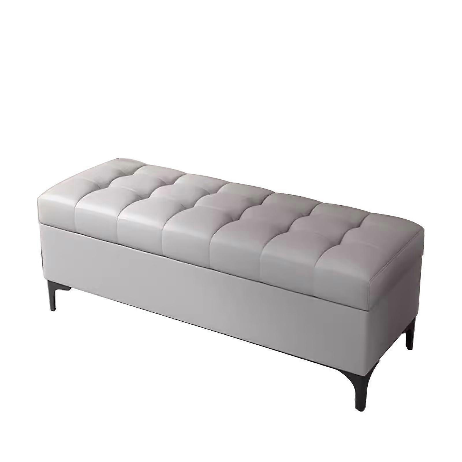 Why you need this bench Keeps living areas tidy by hiding blankets, pillows, books, and toys in a large, outofsight compartment. Adds usable seating or surface space without taking extra room—combines storage, seating, and occasional table use in one piece. Delivers a modern, enduring look that fits multiple rooms and décor styles. Key benefits Spacesaving storage: A hidden compartment reduces clutter and makes daily cleanup fast and simple. Multifunction design: Use as a bed bench, entryway bench, coffee table, storage ottoman, or makeup stool to match changing needs. Durable, lowmaintenance finish: Faux leather is easy to wipe clean and resists everyday wear. Stable, floorfriendly support: Sturdy black metal legs with antislip foot pads protect floors and keep the bench steady over time. Stylish and subtle: Tufted upholstered and minimalist silhouette add a modern, sophisticated touch to any room. Features at a glance Tufted upholstered seat with faux leather covering Hidden internal storage compartment for blankets, pillows, books, toys, and more Strong black metal legs with antislip foot pads Available in multiple sizes to suit bedroom, living room, hallway, or dressing area Easytoclean surface for loweffort maintenance Typical use scenarios 1. Entryway: Place the bench by the door to store shoes, scarves, and dog leashes inside while providing a comfortable spot to sit when putting on or taking off shoes. 2. Bedroom footboard: Position at the end of the bed to store extra bedding and pillows and to provide seating while dressing. 3. Living room or studio: Use as a storage ottoman and extra seating; the doubles as a low table for trays, books, or a laptop. This storage bench blends practical organization, versatile function, and a clean modern aesthetic—ideal for anyone looking to save space and reduce clutter without sacrificing style.