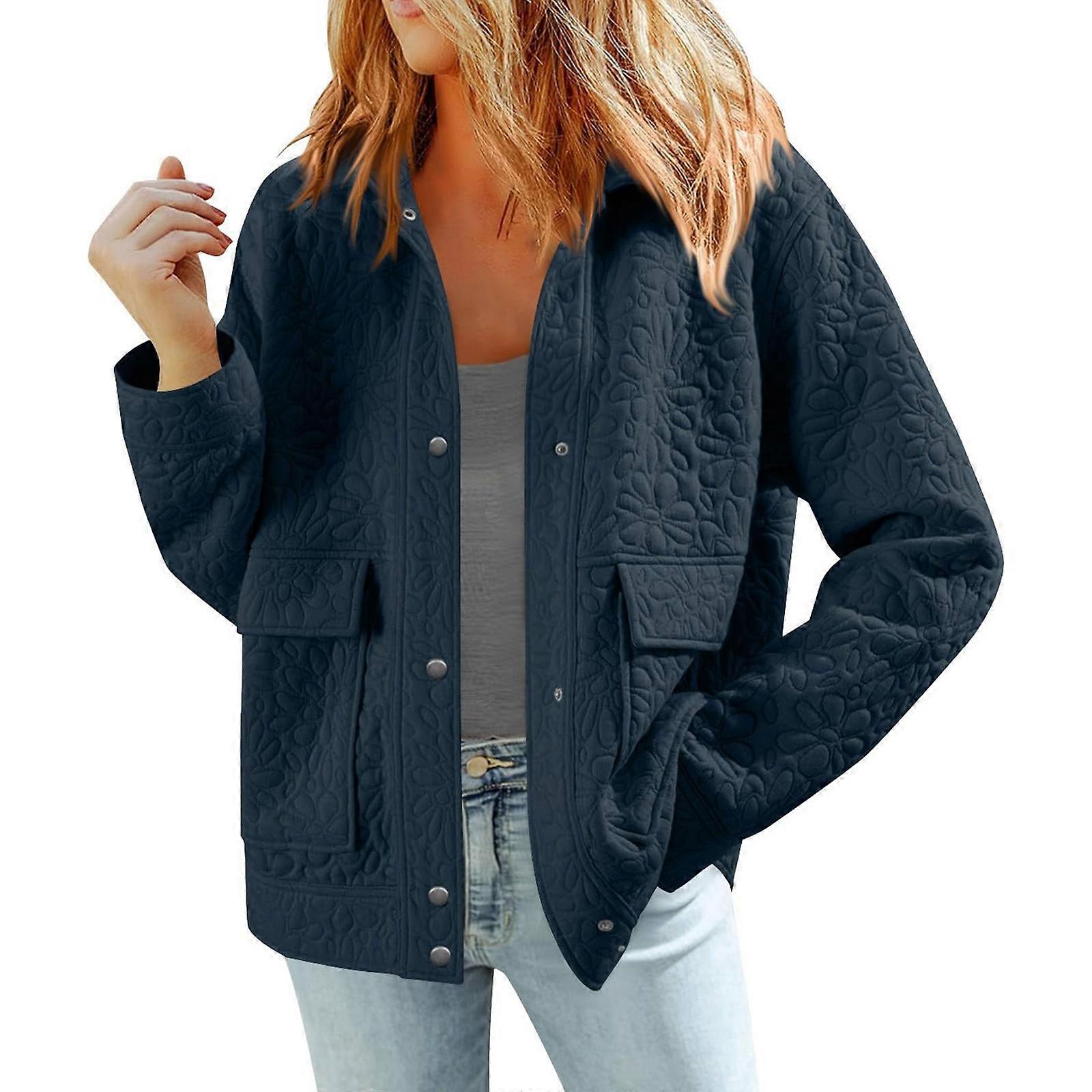 Jackets for Women Casual Long Sleeve Collared Jacquard Coats Trendy Button Down Shacket Jacket with Pockets Navy Blue XL