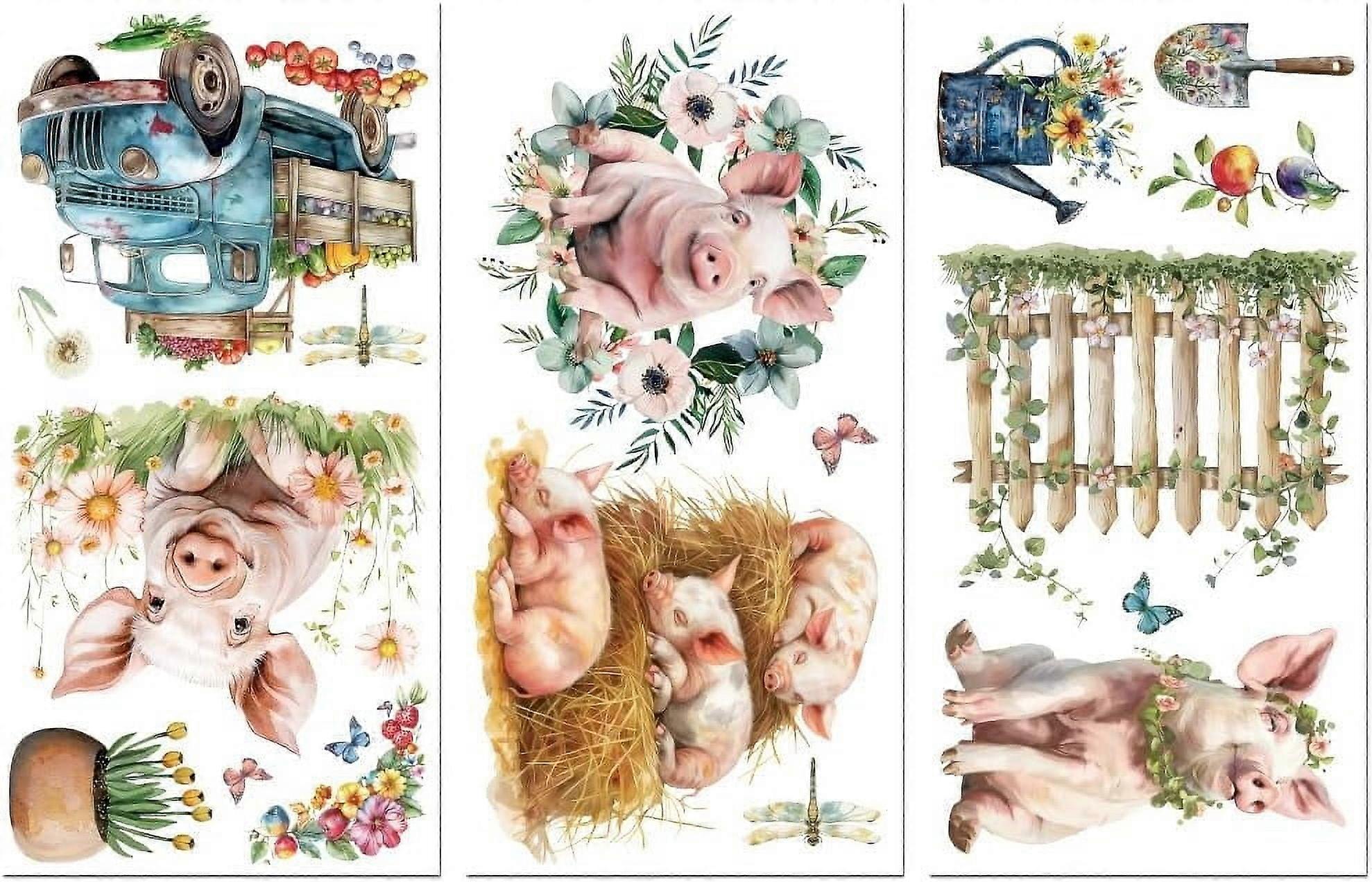 Waterproof UV Transfer Decals 6"x12" 3Pcs, Pig & Flower Design for Furniture, Crafts, Glass, Wood, Plastic - Compatible with Farm Dresser