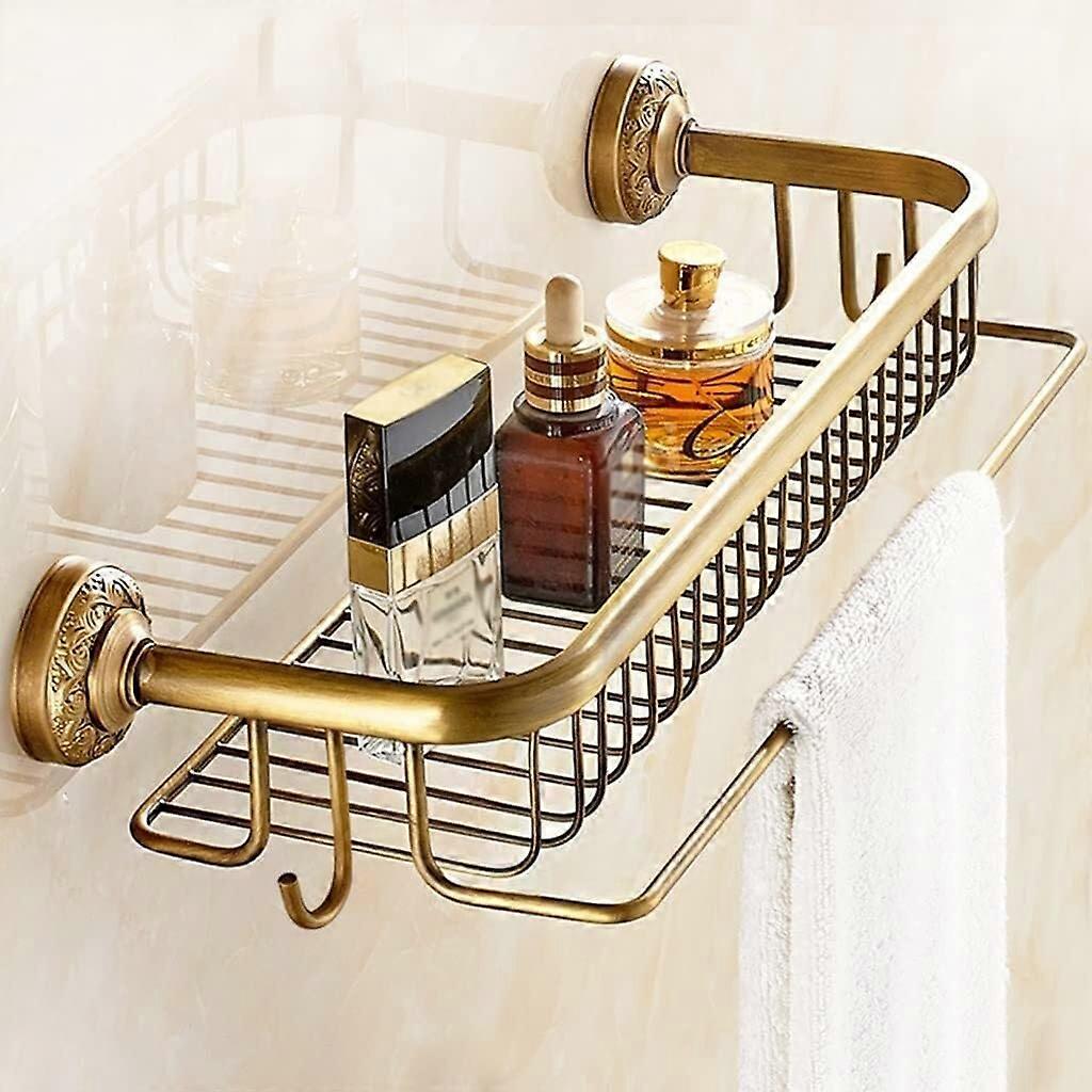 Antique Brass Shower Caddy with Towel Hook for Bathroom or Kitchen Storage of Shampoo, Cosmetics, Spices