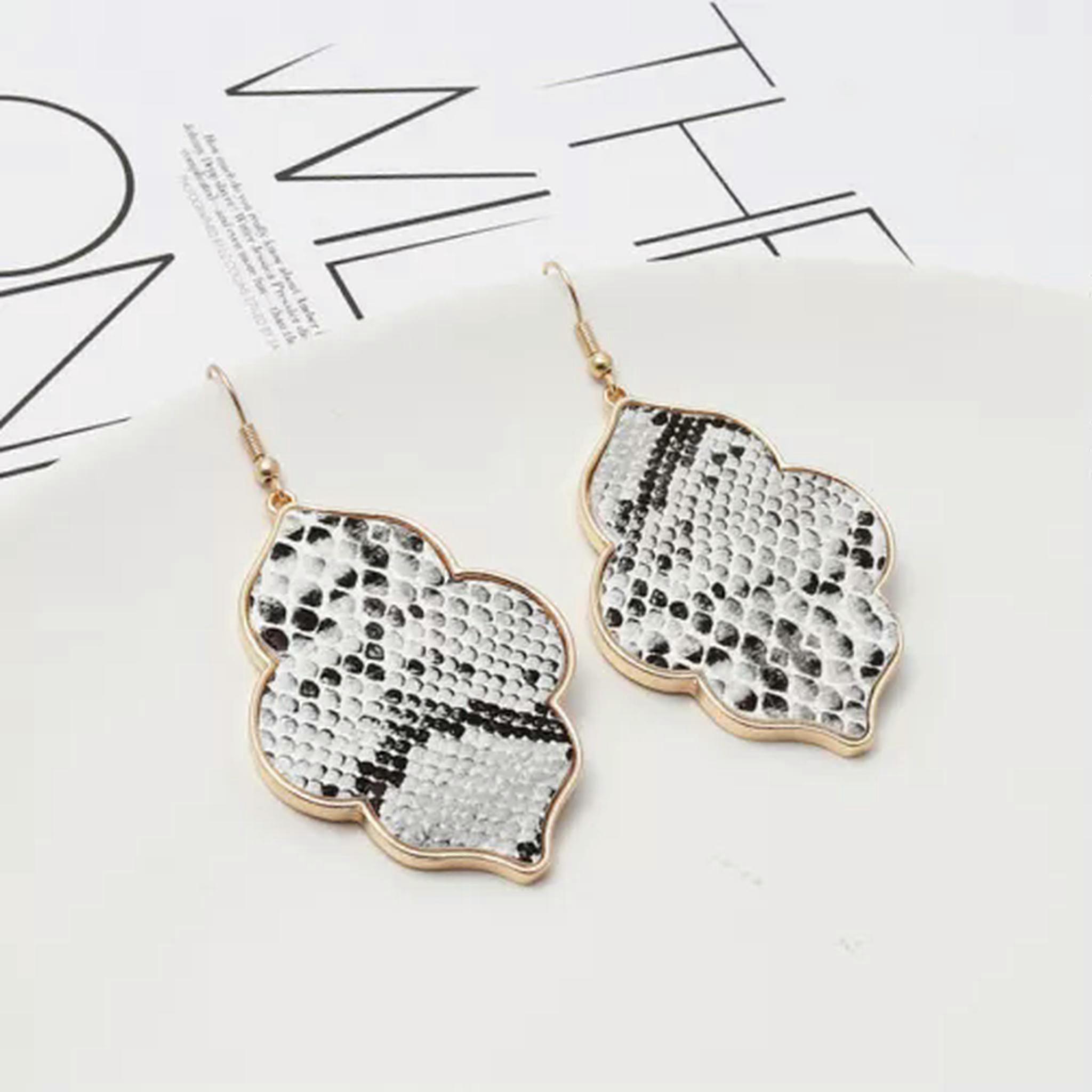 RSAMD Cheetah Leopard Natural Shell Floral Statement Moroccan Earrings with Gold Frame-Snakeskin Welcome to our jewelry emporium that's brimming with dazzling options for every style seeker. For the lovely ladies, we have an array of enchanting pieces. From the dainty necklaces that delicately adorn your collarbone to the elaborate rings that make a bold statement. There are bracelets that add a touch of grace and earrings that enhance your beauty. But don't think we've forgotten about the gentlemen! We have a selection of masculine and stylish accessories too. Sturdy rings for a touch of rugged charm, sleek bracelets that exude sophistication, and understated necklaces that add a hint of refinement. Our collection combines timeless classics with modern trends, crafted with precision and using top-quality materials. Whether you're looking for a piece to wear on a daily basis or for a special event, we've got you covered. So, step into our world of jewelry and discover that perfect piece that reflects your individuality, no matter your gender! Suitable for Gifting Fit for Every Occasion 100% New and of High Quality Crafted from Professional-Quality Materials Easy to Pair and Wearable at All Times and Places