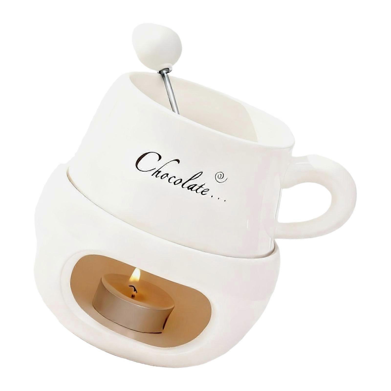 Multifunctional Ceramic Small Melting Pot with Fork For Fondue Cheese Chocolate And Sauces Warmer Mug Cup Kitchen Tool White