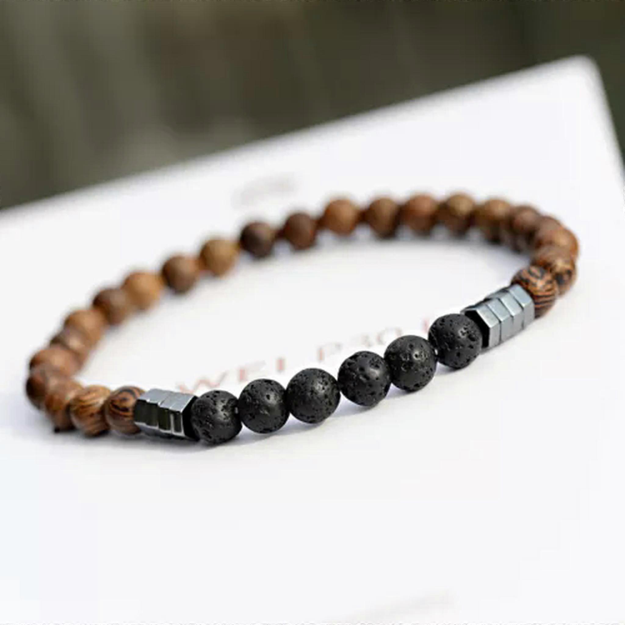 RSAMD Fashion Women Men's Natural Wood Beads Hematite Charm Elastic Strand Bracelets-Lava