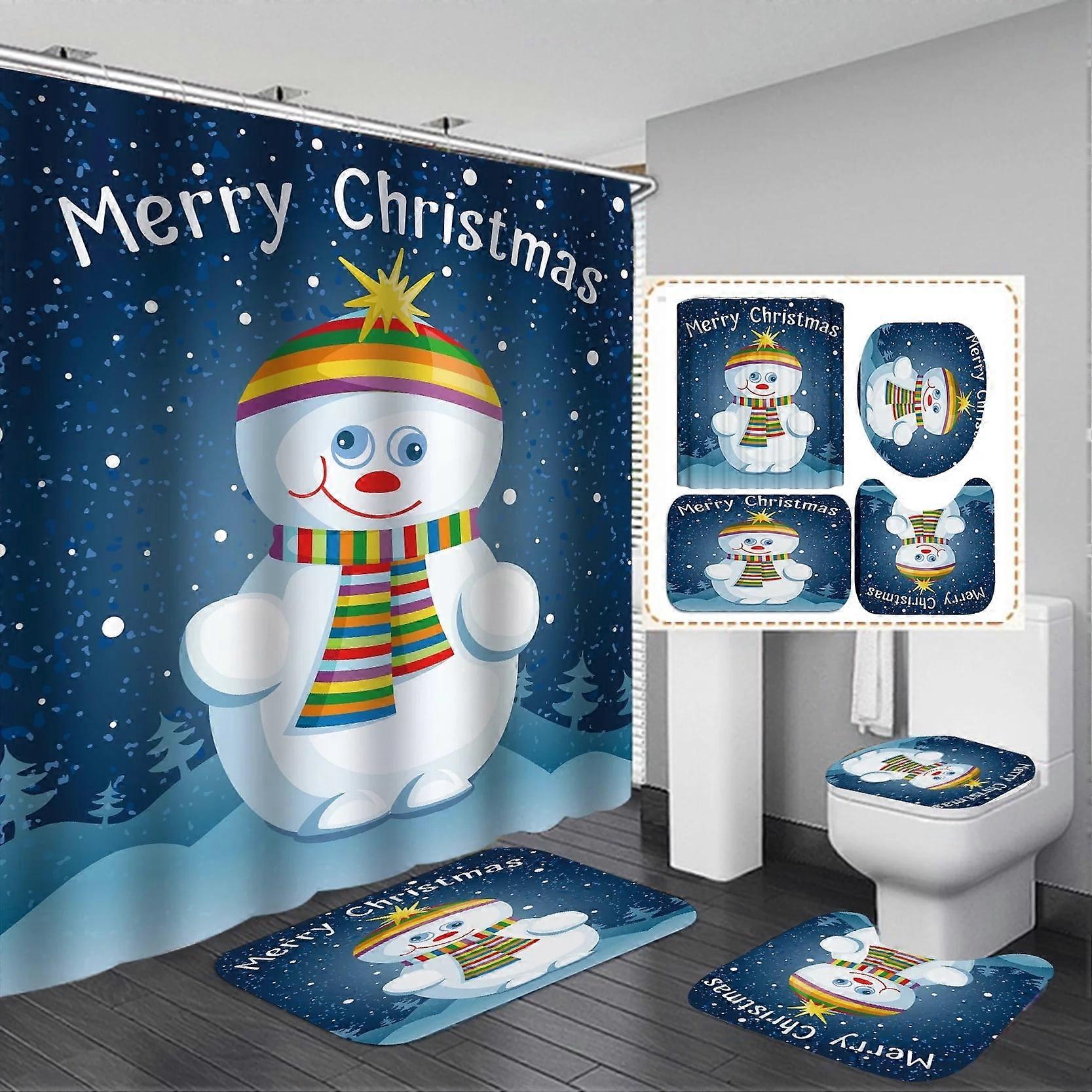 4 Pcs Christmas Shower Curtain Set with Non-Slip Rug, Toilet Cover & Bath Mat, Waterproof Polyester for Christmas Decor