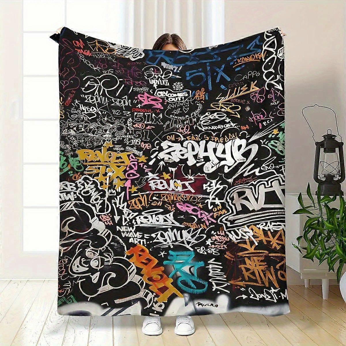 1 Graffiti Art Flannel Blanket - Soft Black Street Pattern, Suitable for Sofa, Bed & Camping, All-Season Warmth, Machine-asdfg178