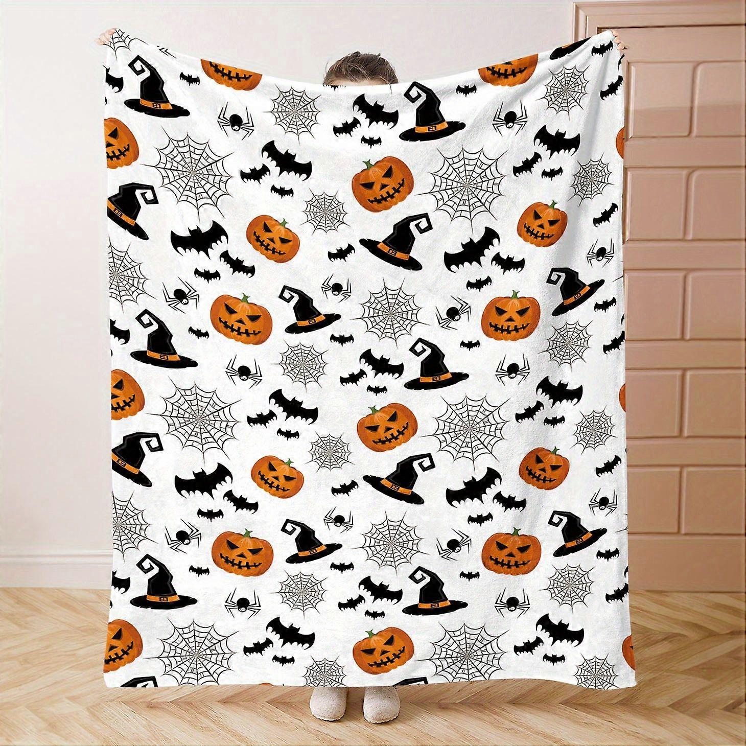 Halloween Flannel Blanket - White Background with Pumpkin Lanterns, Bats, Witch Hats, and Spider Patterns, Soft and Comf-asdfg399