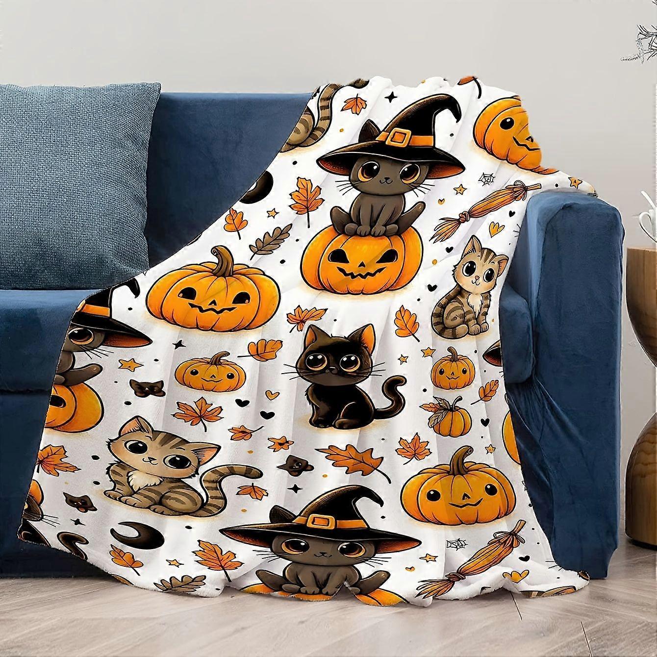 Cats & Pumpkins Flannel Blanket - Soft All-Season Bedspread with Cute Cats, Orange Pumpkins, Brown Cats - Lightweight Wa-dfghj284