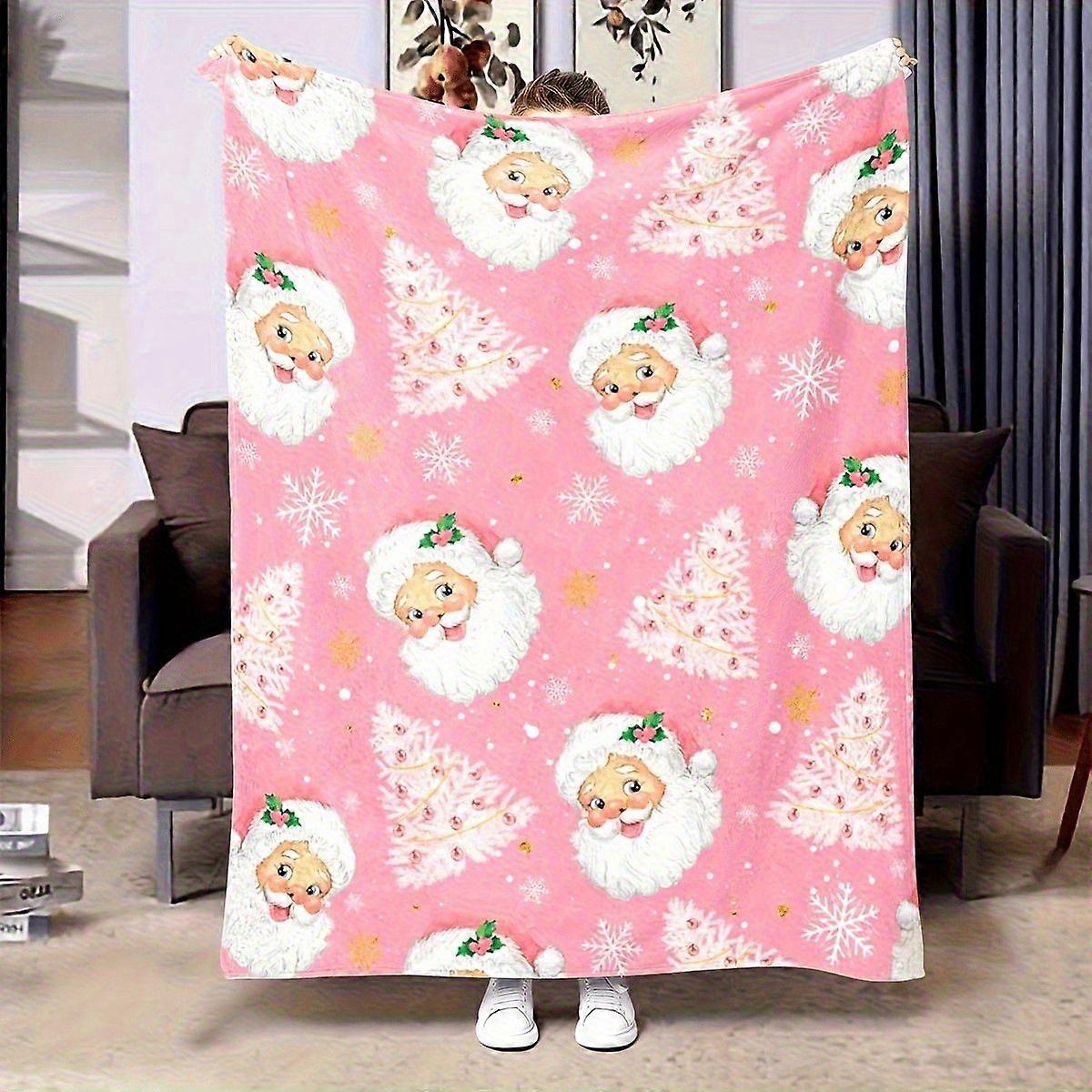 Cozy Pink Christmas Throw Blanket Soft Fleece with Santa Merry Christmas Tree Print, Perfect for Sofa, Chair, Bedroom De-mnbvc169