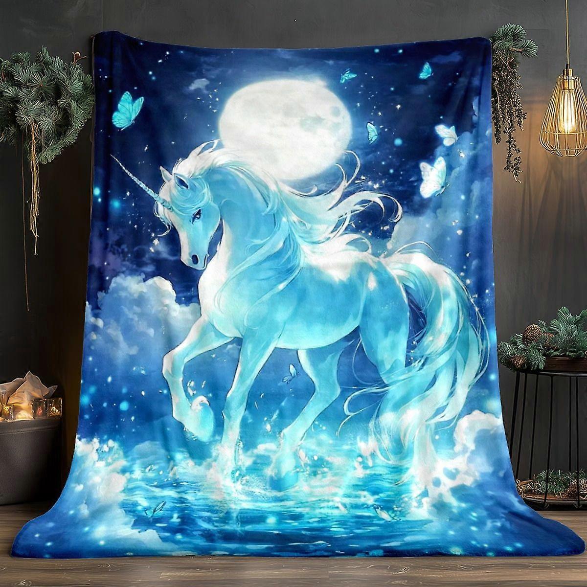 Enchanted Unicorn in Moonlight Flannel Blanket - Soft & Warm 280GSM, Vibrant Blue Unicorn with Butterflies & Stars Desig-wsxcv105