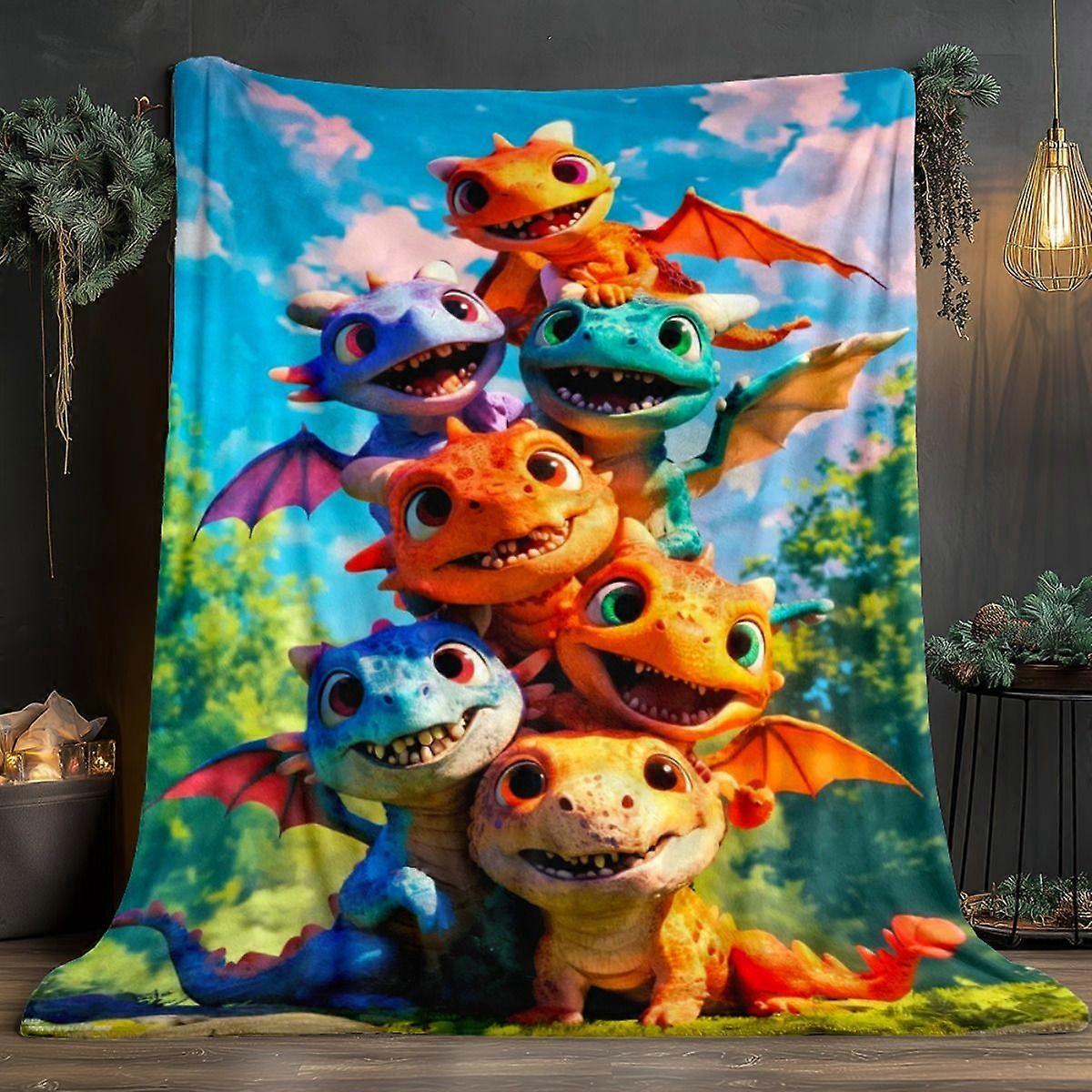 Dinosaur in Sky HD Printed Flannel Blanket - Soft & Warm 280GSM All-Season Bedspread with Cute Blue & Orange Dinosaurs, -ojhgf358
