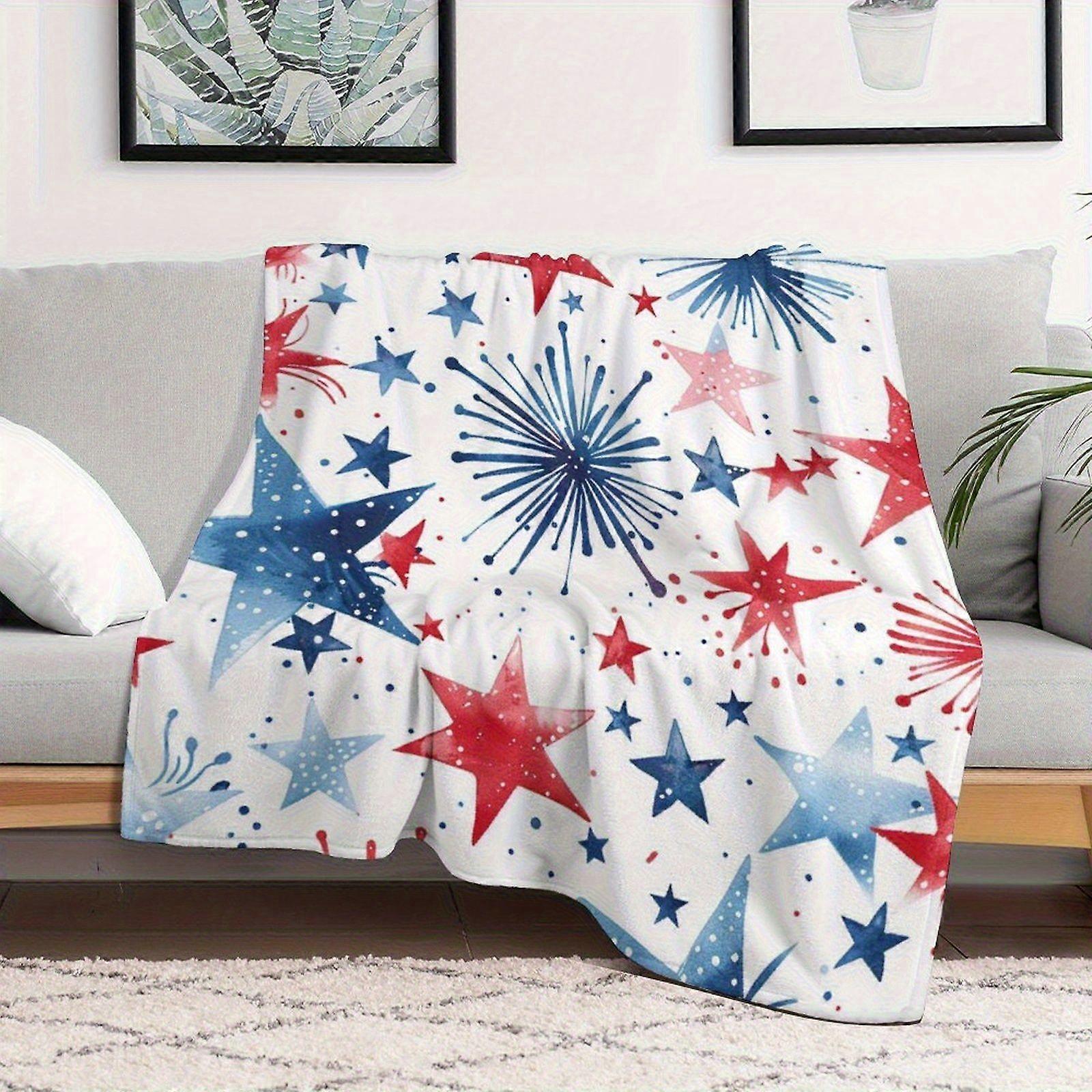 PrintedInUSA Patriotic Star Pattern Flannel Blanket - Soft Warm Cozy Throw 280gsm, Red White Blue Firework-Inspired Star-ojhgf439