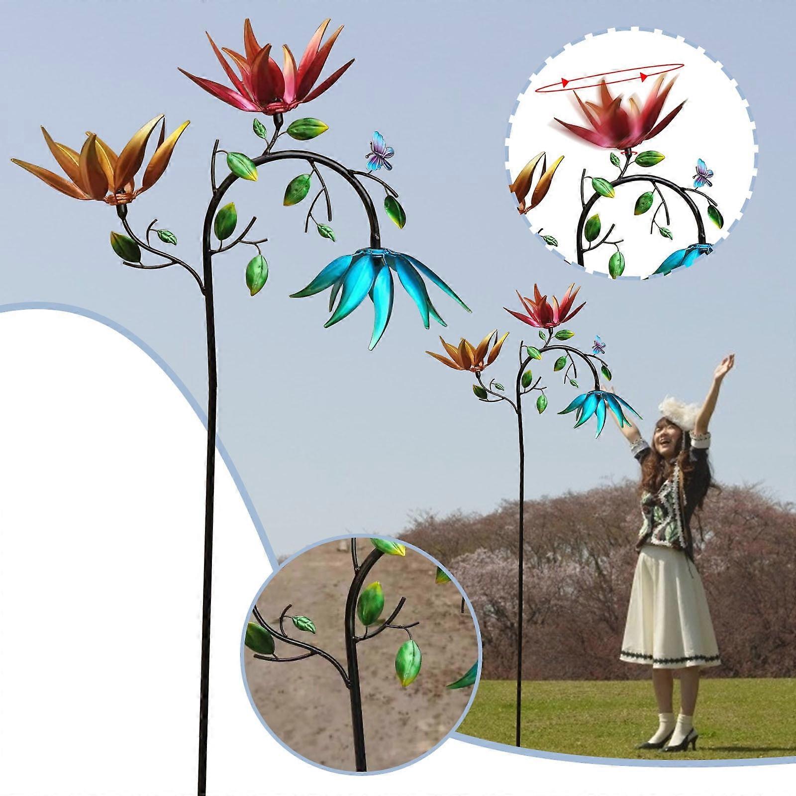 Large Metal Wind Spinner with 3 Flowers & Butterflies, Yard/Garden Art, Outdoor Decoration, Compatible with Home