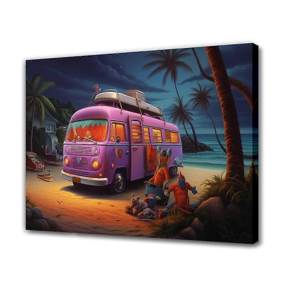 Two Figures by Purple Bus at Sandy Beach Canvas Poster, 16x24inch, Frame-style, Compatible with Bedroom, Office Decor