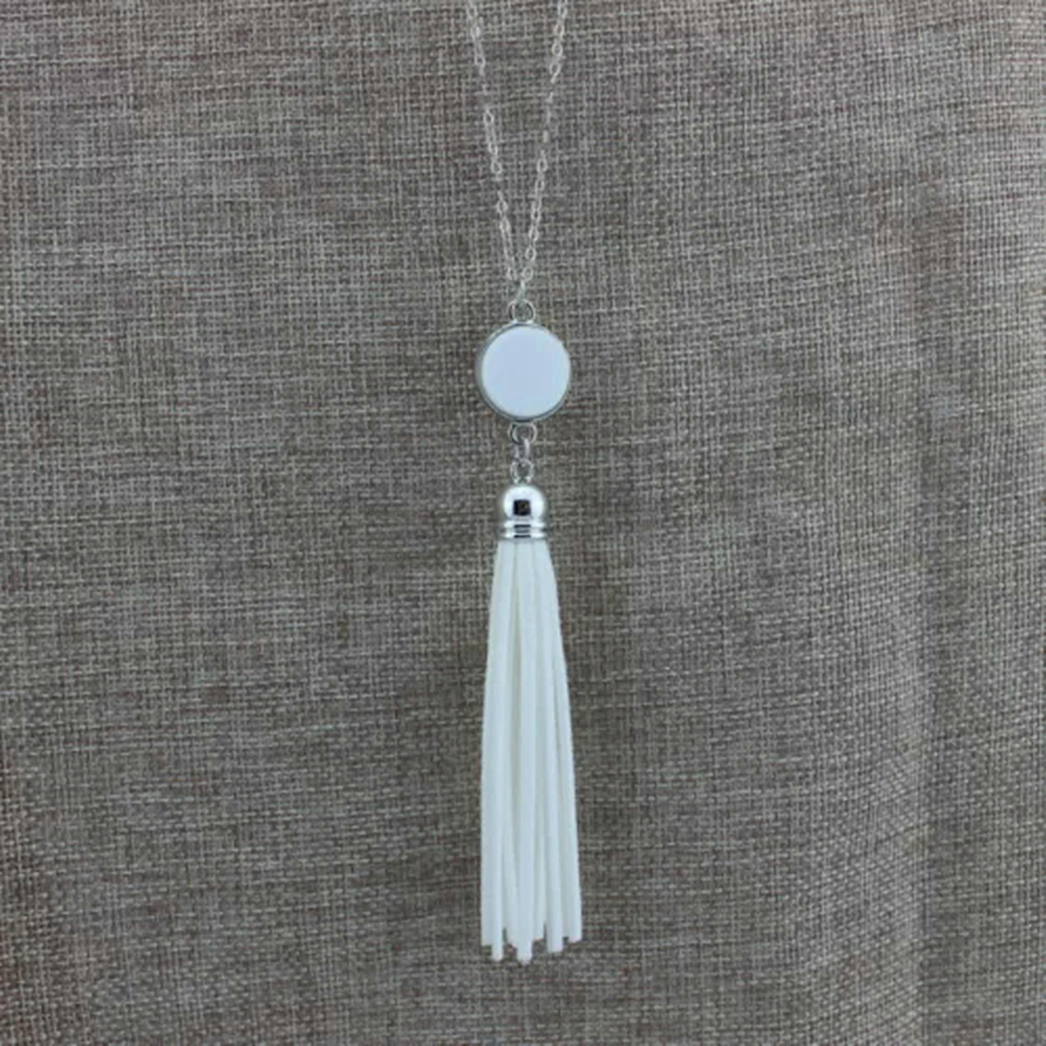 RSAMD Long Velvet Leather Tassel Pendant Necklace with Monogram Blanks Engraved Disc-Silver White
