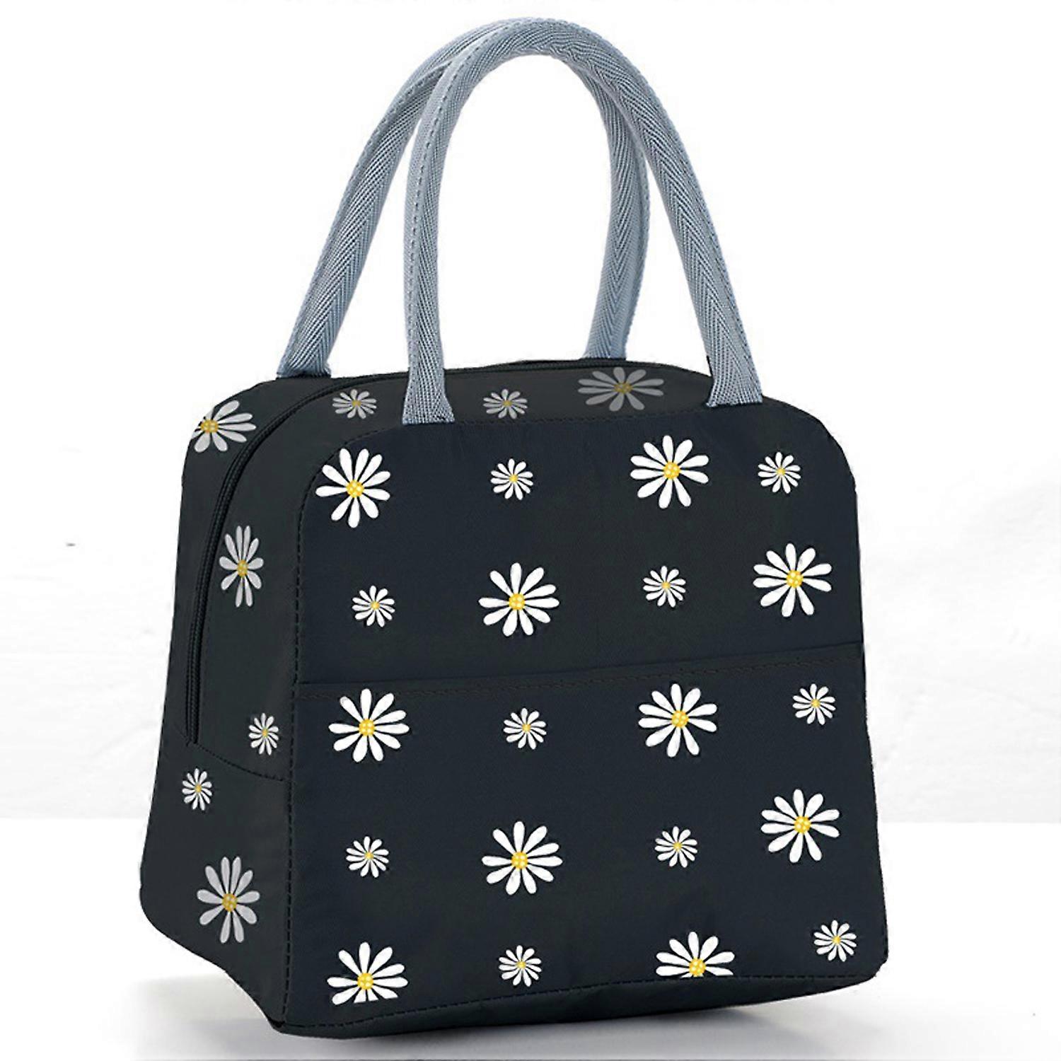 Flower Daisy Insulated Lunch Bag Thermal Insulated Lunch Bag Portable Handbags for Office Work Picnic,Black