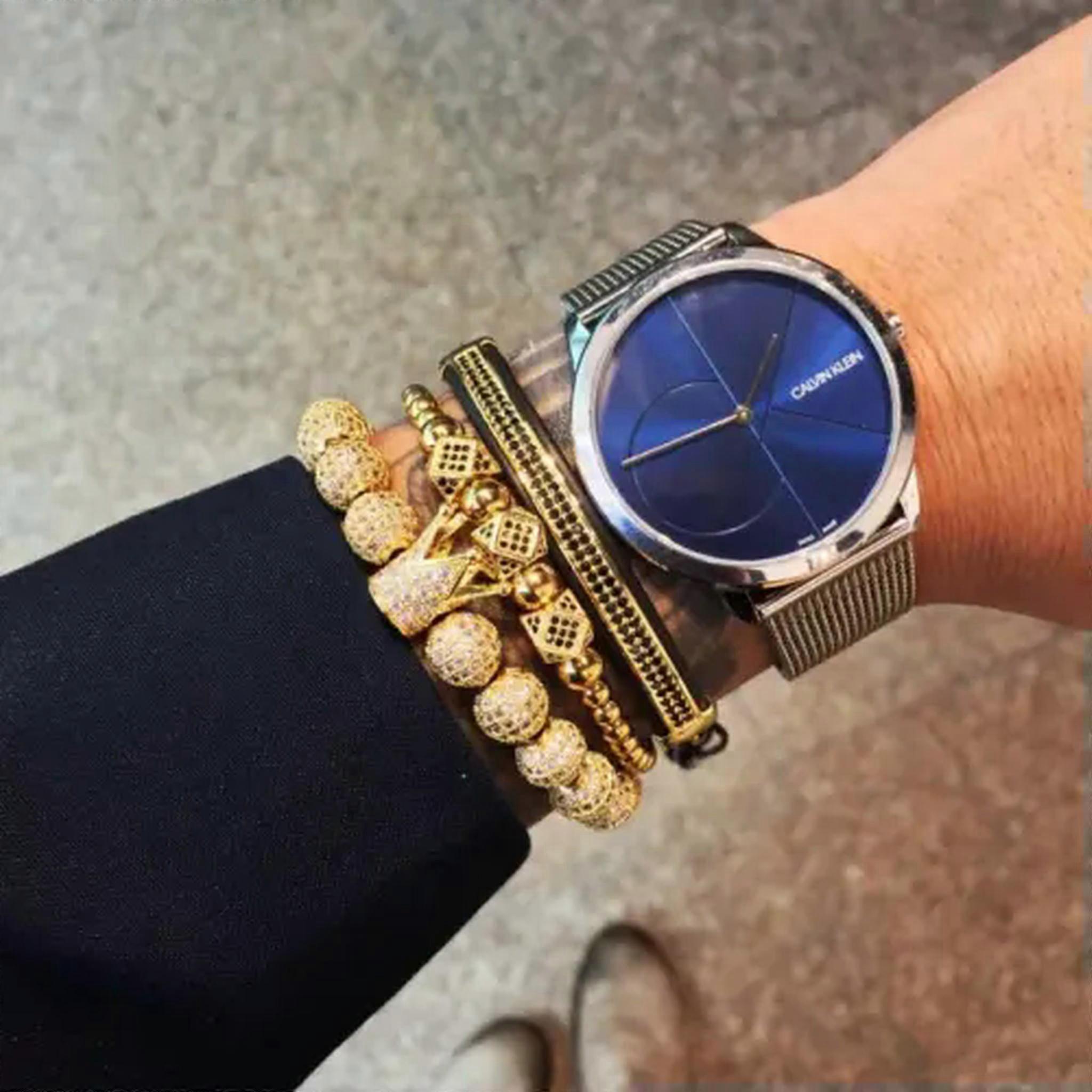 RSAMD Fashion Men's Silver Micro Pave CZ Zircon Ball King Crown Braided Bracelets USA-Gold Set