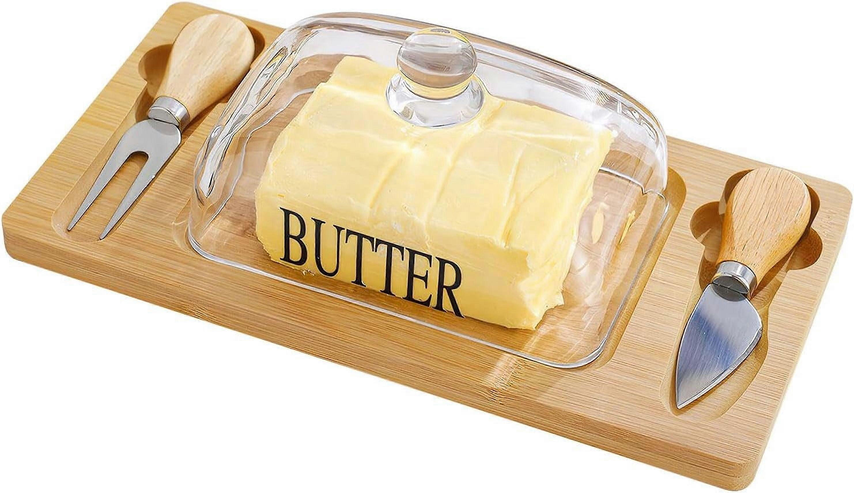 Square Butter Dish with Glass Lid & Bamboo Base, Compatible with Wood, Double Knife, Dishwasher Safe for Kitchen, Refrigerator