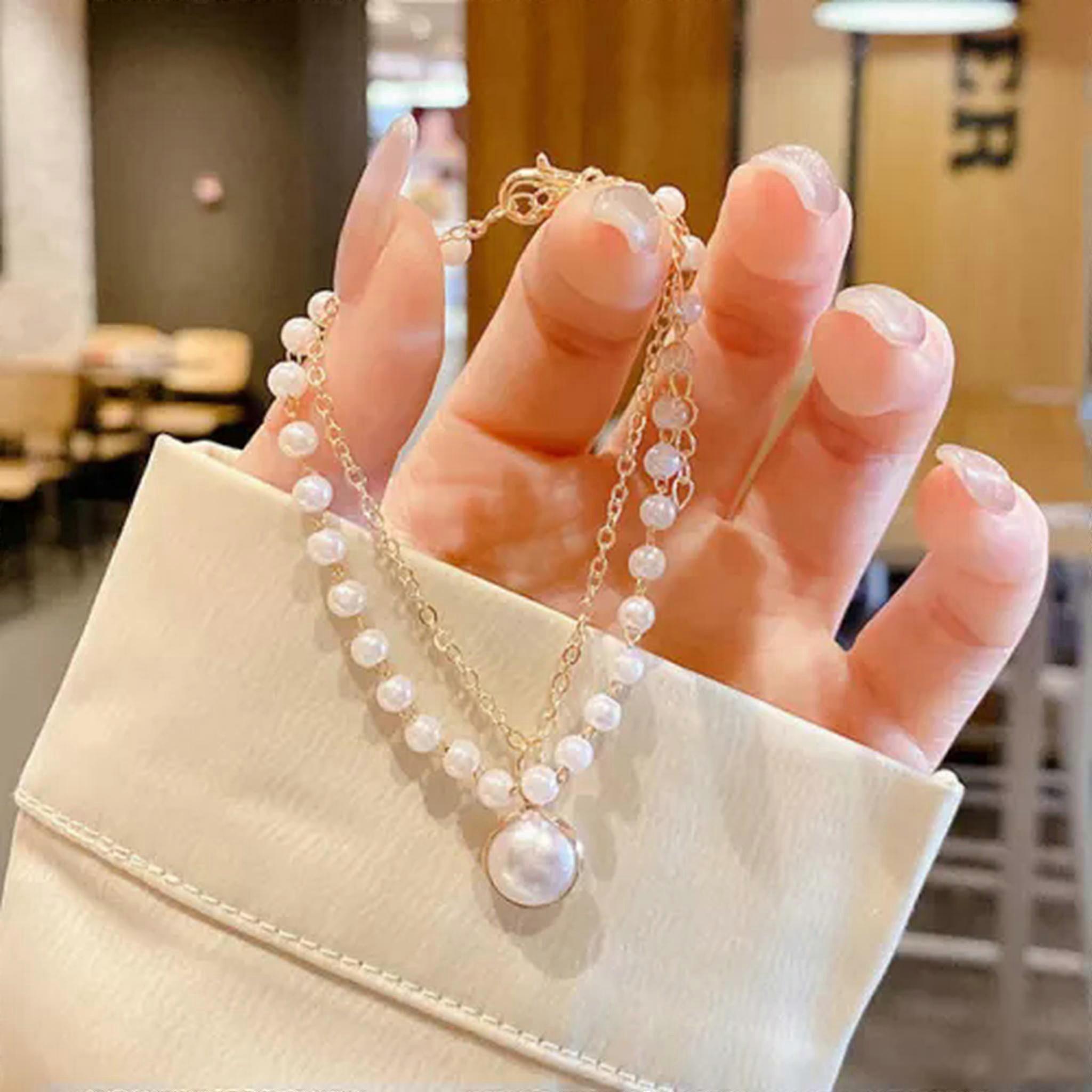 RSAMD Fashion Double Layer Chain Pearl Necklace Pearl Alloy Charm Pendant Necklacjo-A4