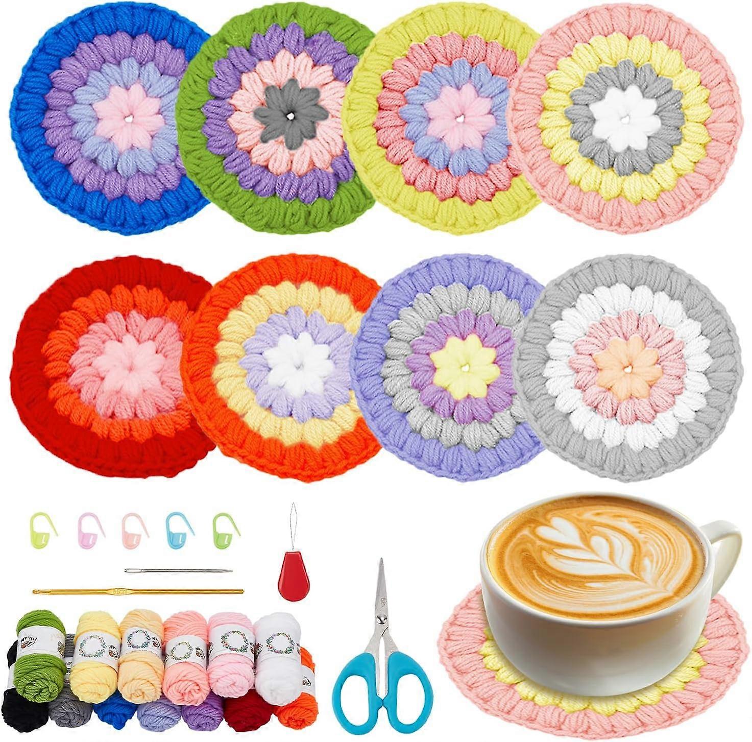 8 Set Crochet Coaster Kit for Beginners, Colorful Tea Coasters Knitting Set with Instructions & Video, Compatible with Yarn Needles
