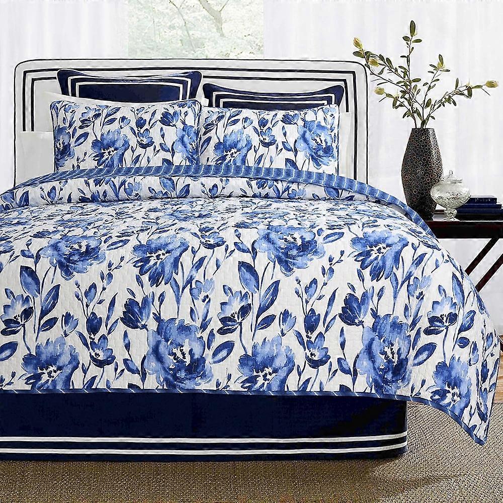 3-Piece Reversible Quilt Bedding Set, 100% Cotton Sapphire Floral Watercolor Coverlet, Bedspread for Bedroom, Apartment - Queen