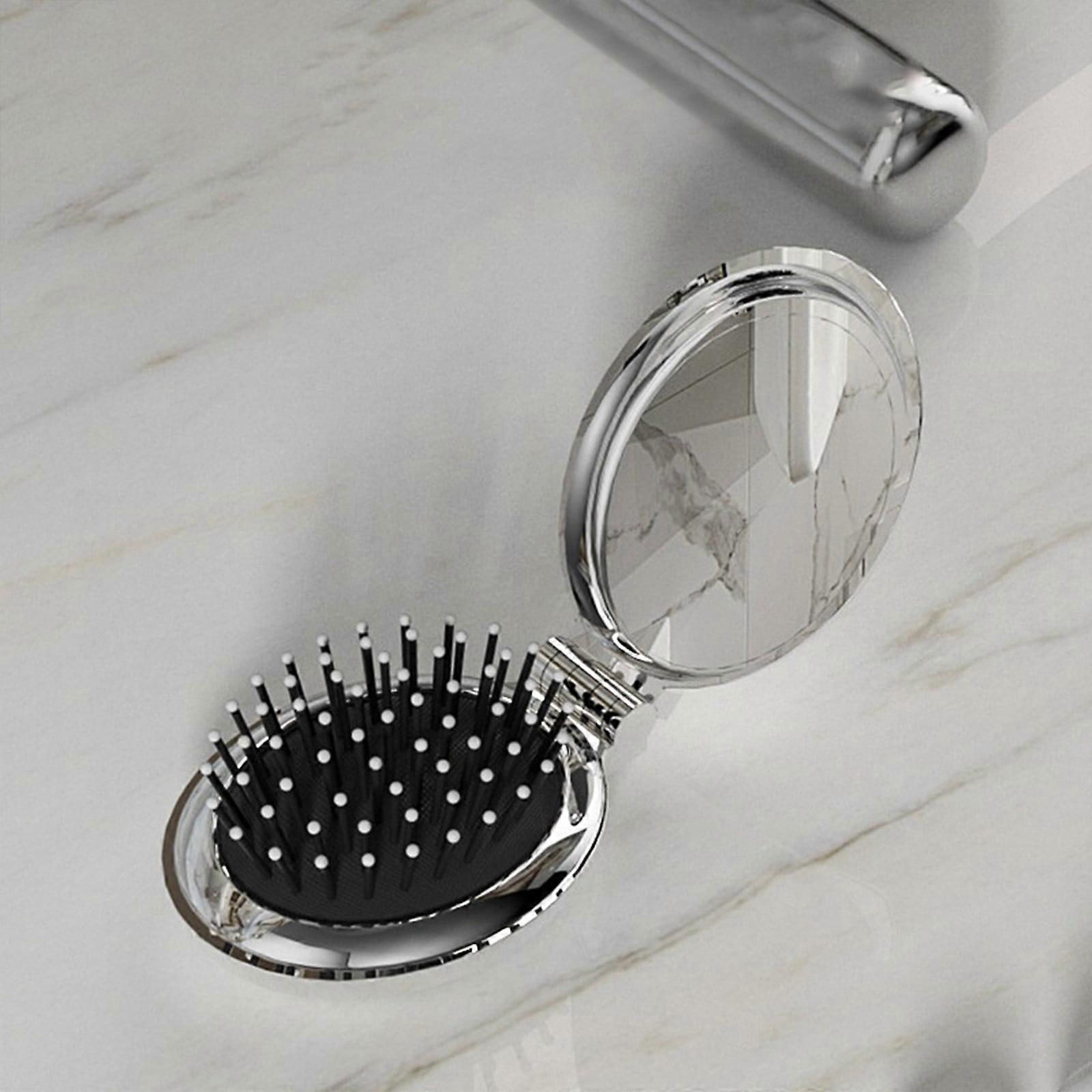 Foldable Travel Mirror Hair Brush, Portable Round Pocket Comb, Compact Massage Brush for Men, Women, Girls, Compatible with All Hair Types
