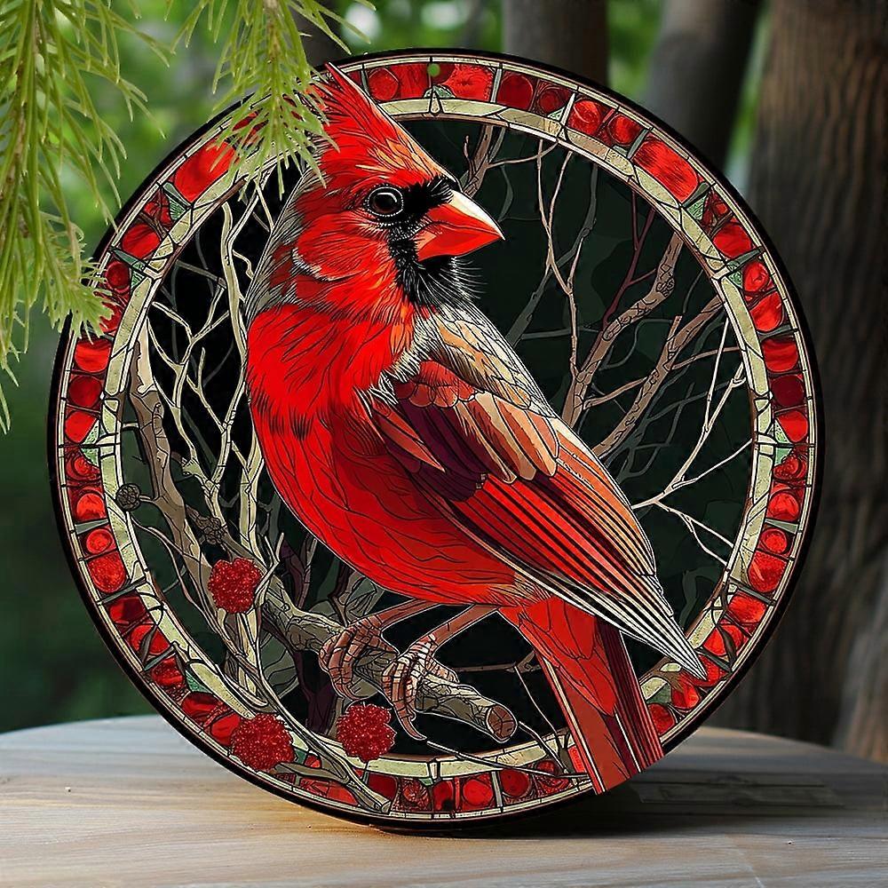 1pc 8x8 Inch Aluminum Metal Sign, Faux Stained Glass Wreath Decor, Cardinal Red Bird Theme, Apartment Decoration, Father's Gift