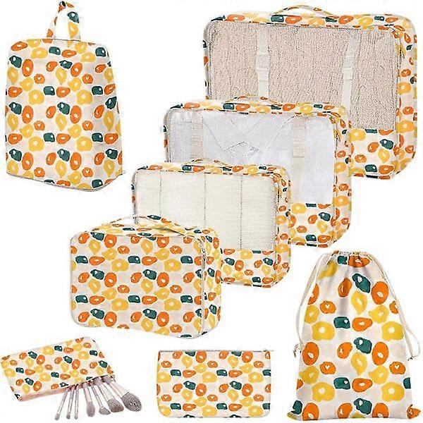 About this product Make packing easier Multiple sizes of travel packing cubes for packing fit perfectly in most suitcases 7 packing cubes: Garment bags L: 16.1*11.8*3.9 inches Garment bags M: 14.2*9.8*3.9 inches Garment bags S: 11.8*8.3*3.9 inches Underwear storage bag: 11.8*7.1*4.3 inches Digital storage bag: 10.2*7.1 inches Zipper bag 17.7*12.2 inches Shoe bag: 15.4*9.4*3.5 inches. Large capacity travel packing cubes make packing for your next trip a breeze. Cubes for travel Designed with double zippers that work perfectly to remove the extra air so that clothes are compressed to save space in your carry-on or backpack. You just need to: 1) Fold your clothes and flatten them to stack them neatly one by one 2) Pack the neat clothes into the packing cubes and close the regular zipper. 3) Put a finger on the back of the zipper in the space when compressing the packing cubes in case the zipper gets stuck in the fabric. Durable Material & Double Zipper Design The packing organizer is made of high quality nripstop polyurethane fabric with exquisite workmanship, super lightweight and durable. Waterproof function protects your clothes neatly from spills or leaks. Easily store your clothes and protect your clothes from stains and creases. Double premium metal zipper design very durable and quick to open/close. Packing Bags for Travel Bags With different sizes, the travel bag can store and classify your clothes such as jackets, sweaters, underwear, socks, towels in different packing cubes for easy access. Some of us travel with capsule wardrobes and others pack multiple outfits for each day of the week. If your packing style is more in line with the latter, you no longer have to sacrifice style for space. A great companion for going out.