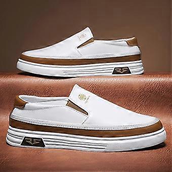 Local warehouse Men's Stylish Slip-On Loafers - White PU Upper with Brown & Golden Accents, Non-Slip Rubber Sole, Comfortable Casual Shoes f