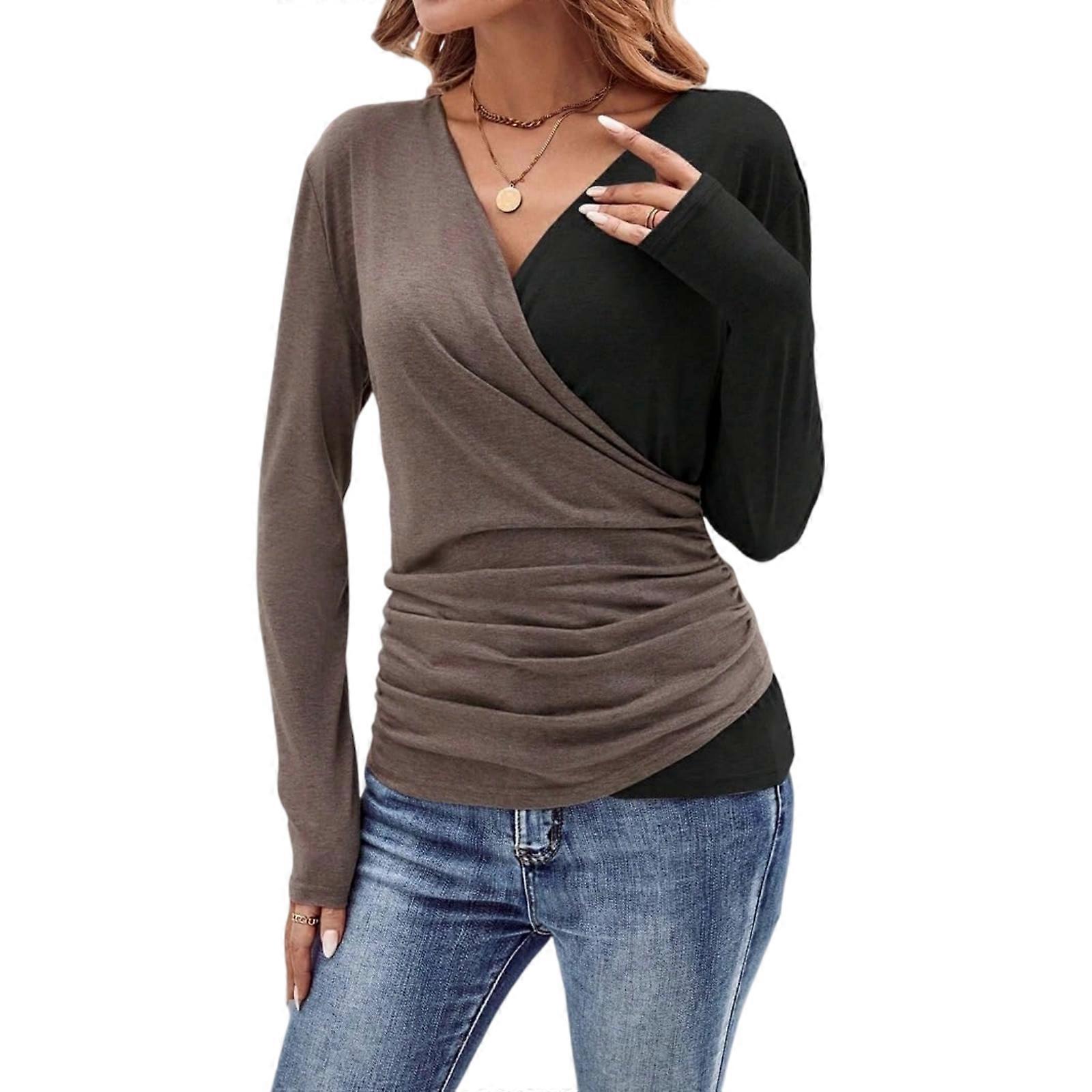 Women's ruffled neckline top, casual women's long-sleeved wrap shirt, fashionable slim-fit pullover. Khaki XL