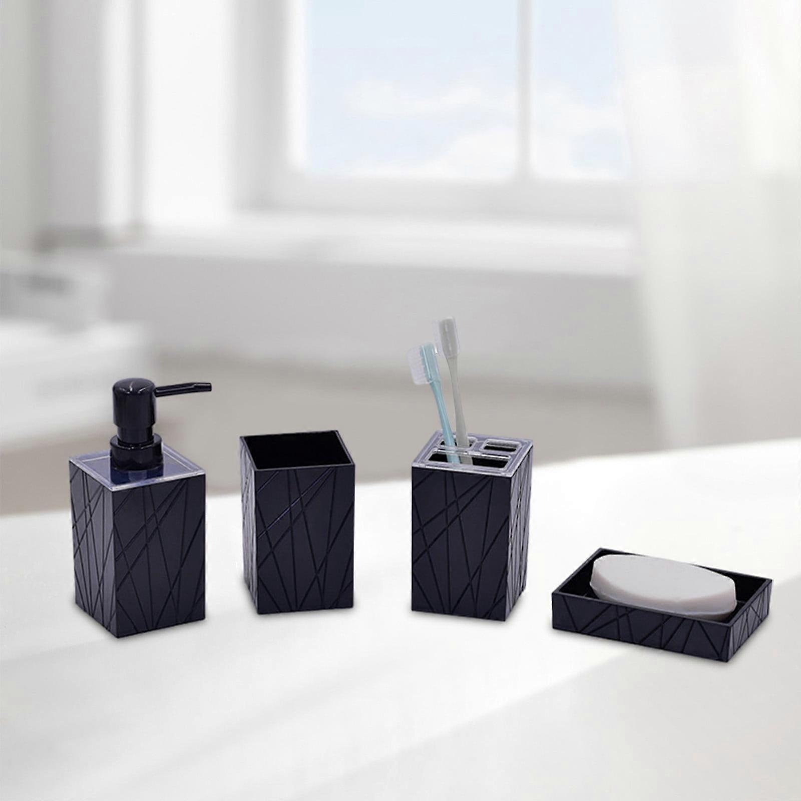 4-Pc Bathroom Set w/ Soap Dispenser, Toothbrush, Tumbler, Soap Dish - Black, White, Gray. Compatible with modern bathroom decor.