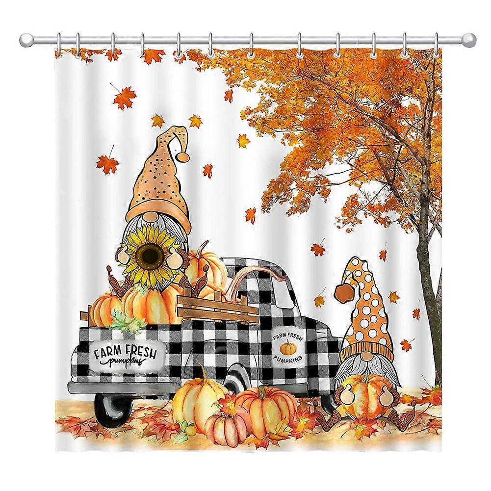 Fall Maple Leaves Gnome Shower Curtain, Autumn Plaid Pumpkins Design, Rustic Waterproof Fabric with 12 Hooks, 72x72 Inch