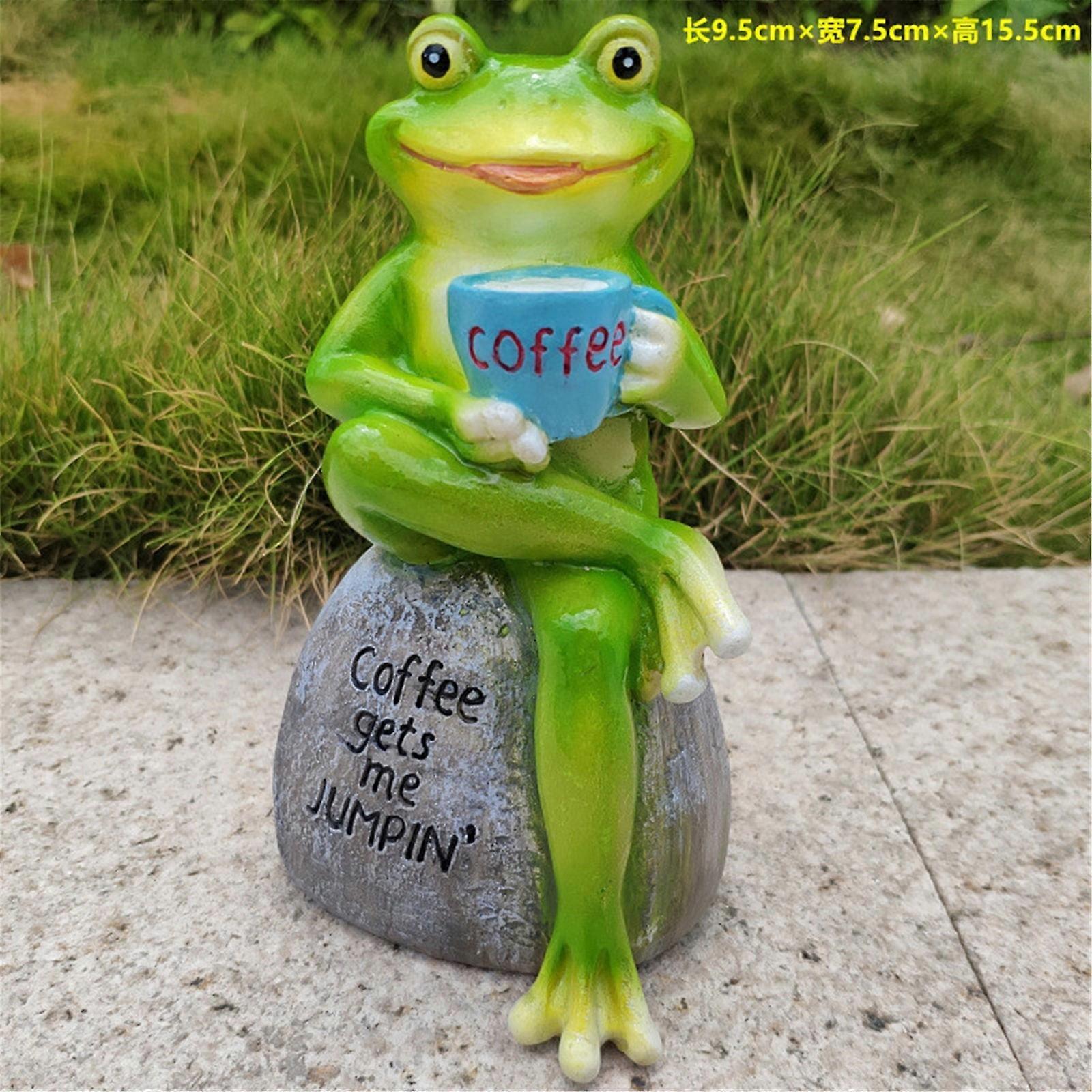 Frog Statue Sitting on Stone Drinking Coffee - Garden Ornament, Yard Decor, Fairy Garden Accessory, Outdoor Home Decoration 1PC