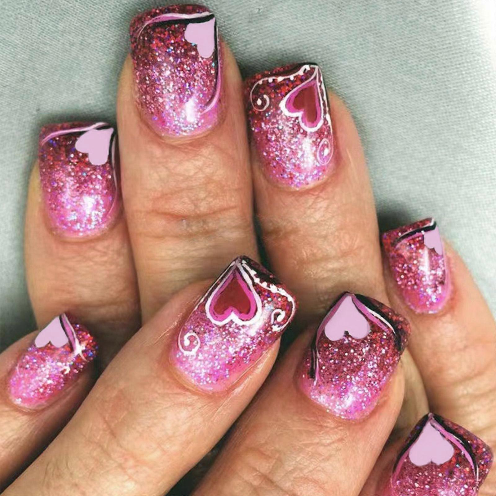 Short Square Pink Heart Glitters Press on Nail 24 Pcs False Nail Manicure For A Stylish Valentine's Day Appearance Multicolor