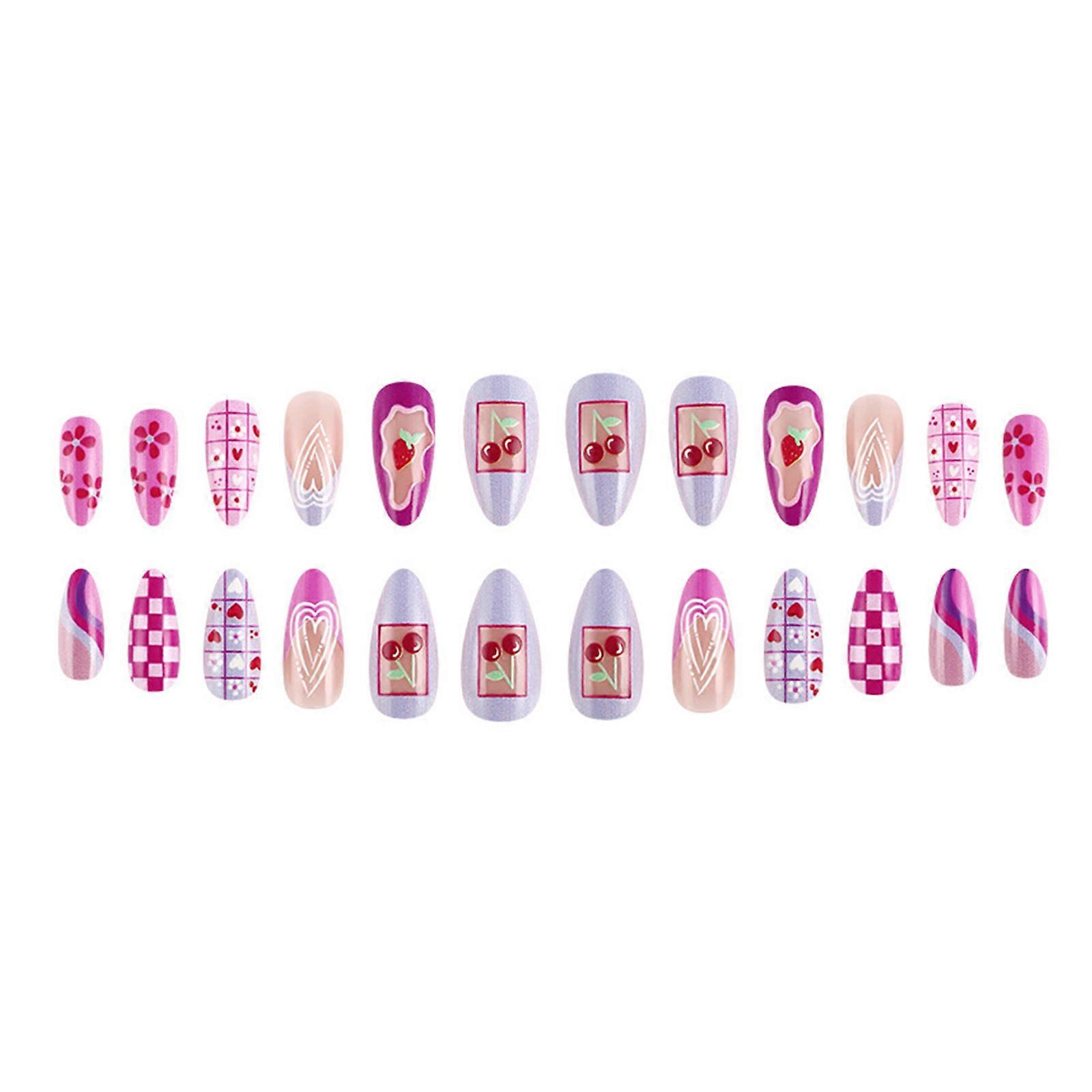 24 Pcs French Tip Press On Nail Almond Medium Stick on Nail Sweet Flower Artificial Nail Heart Strawberry False Nail Multicolor