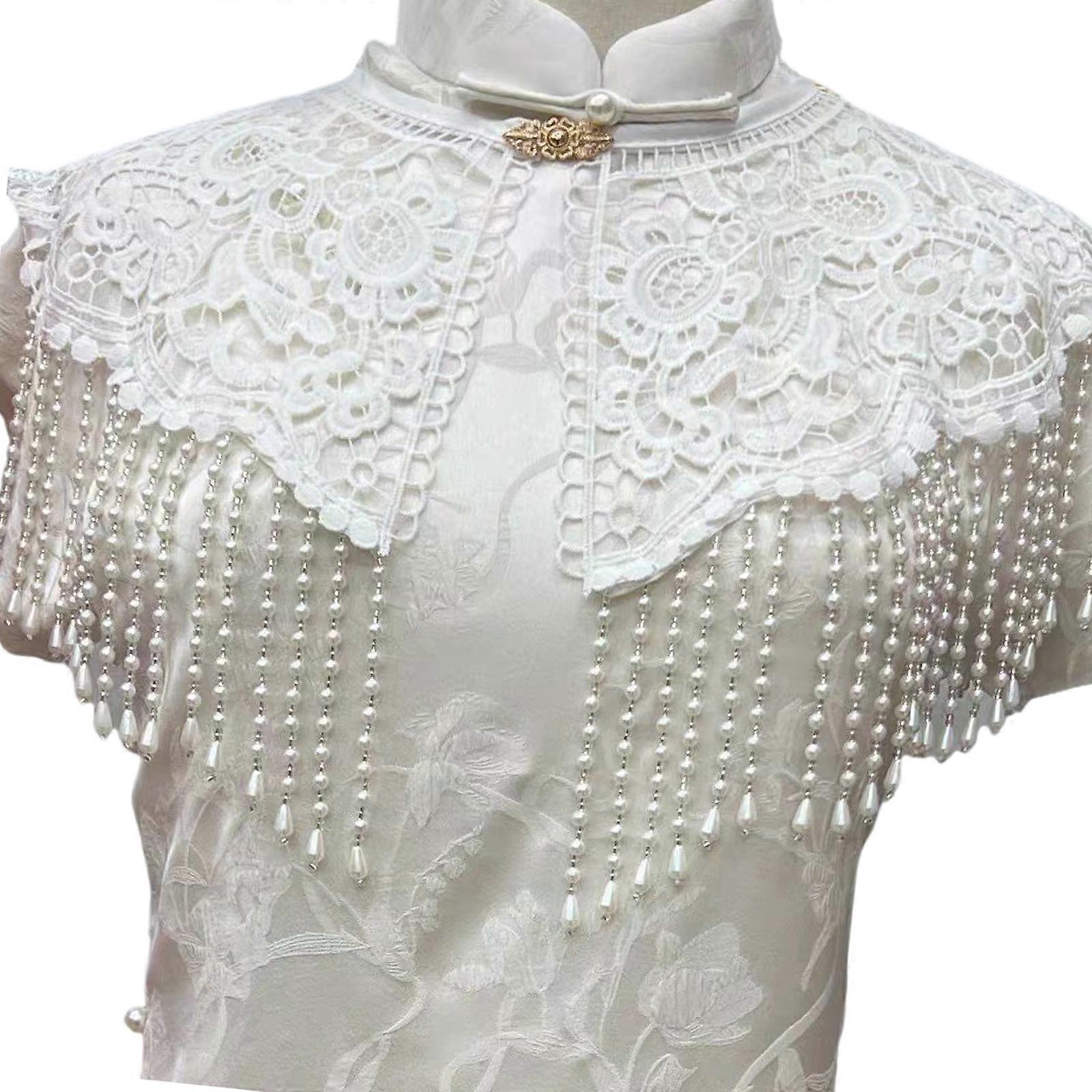 Features: Feature quality imitation pearls decoration and tassels design, it showcases a unique classical charm and elegant temperament. The combination of the luster of pearls and the tassels adds a sense of luxury to the overall design. Using soft ester fiber fabric, it is skin friendly and comfortable, with good breathability, and will not feel uncomfortable even if wear for long time. Adopting new Chinese style improved version, combining the charm of traditional cloud shoulders with modern fashion charm, showcasing a perfect combination of elegances and fashion. Whether it's weddings, banquets, traditional festivals, or daily travel, you can add a classical charm and fashion sense to your outfits. Specifications: Fabric: pearls, tassels, polyester fabric Craftsmanship: Hand-woven and sewing Size: Suitable for most adult women Color: black, white Suitable for shoulder width 35-40cm/13.78-15.75inch Practicality: Ideal for matching with cheongsams, suitable for weddings, dinners, formal occasion, adding elegances and classical charm Package Includes: 1 Piece Fringed Shawl note: Please allow 1-2cm errors due to manual measurement. Please allow for slight color differences due to different display resolution.